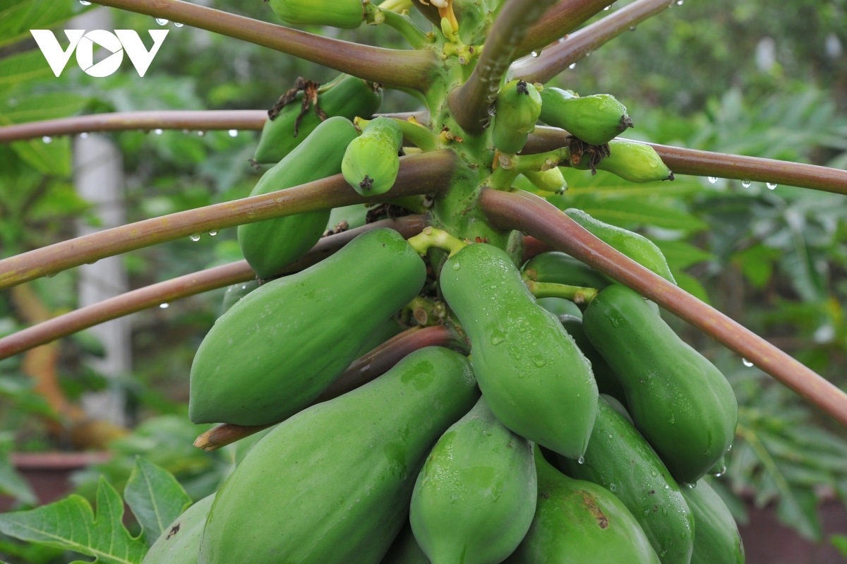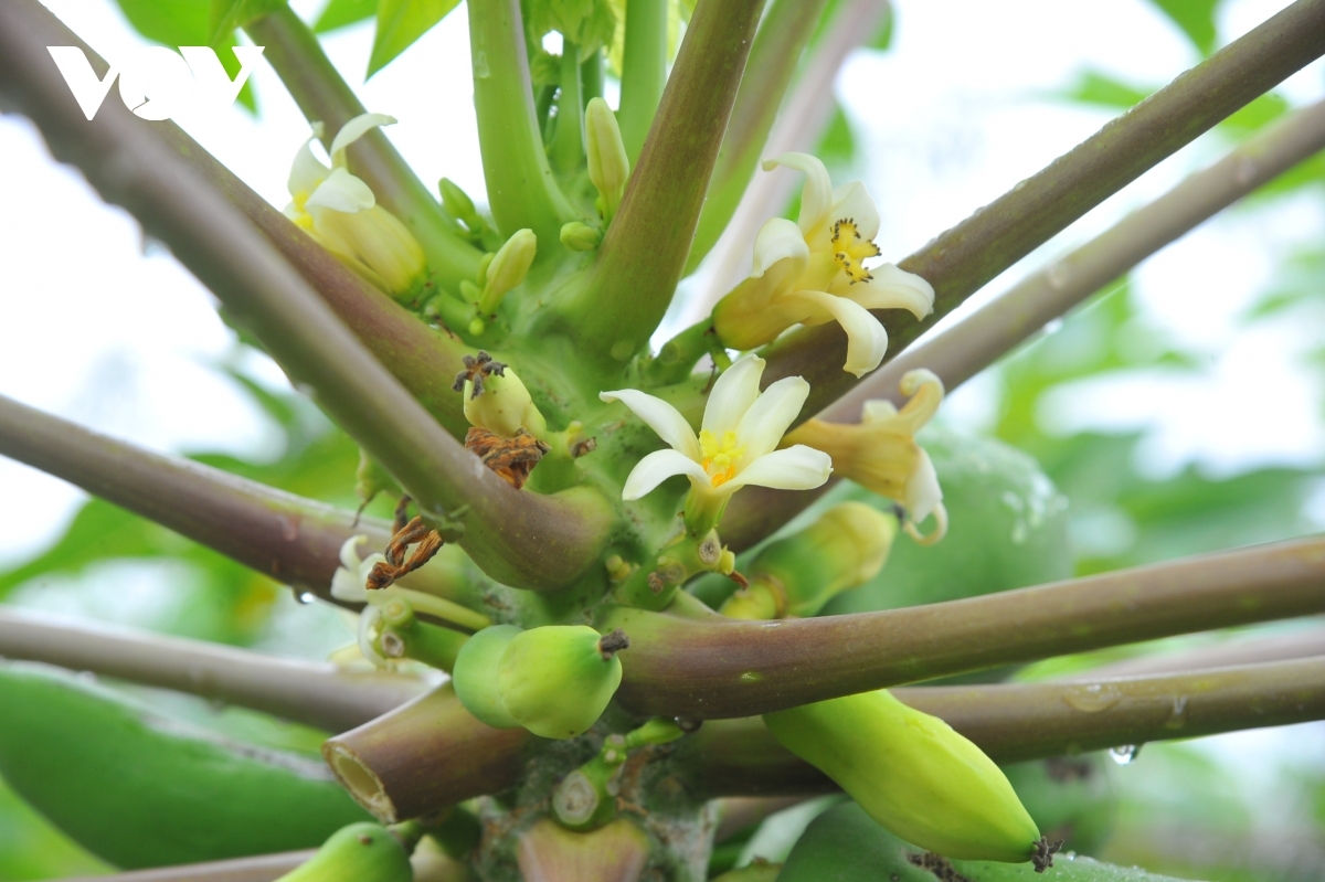 Papaya trees bearing flowers in full bloom, green fruit, and fresh leaves are among the most popular items with customers. |