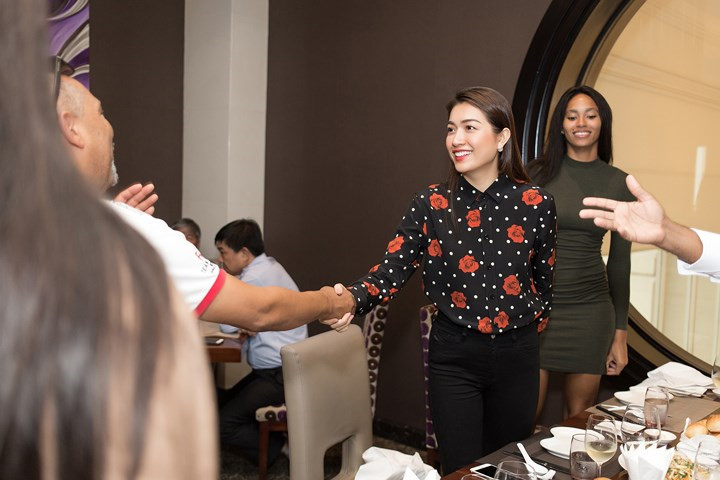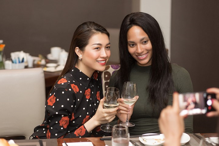 The first runner-up of Miss Universe Vietnam 2015 Le Hang (C) receives Raquel Pelissier (R) at the airport. They have known each other since Miss Universe 2016. Miss Haiti praises Le Hang for staying so beautiful after two years away from the competition.