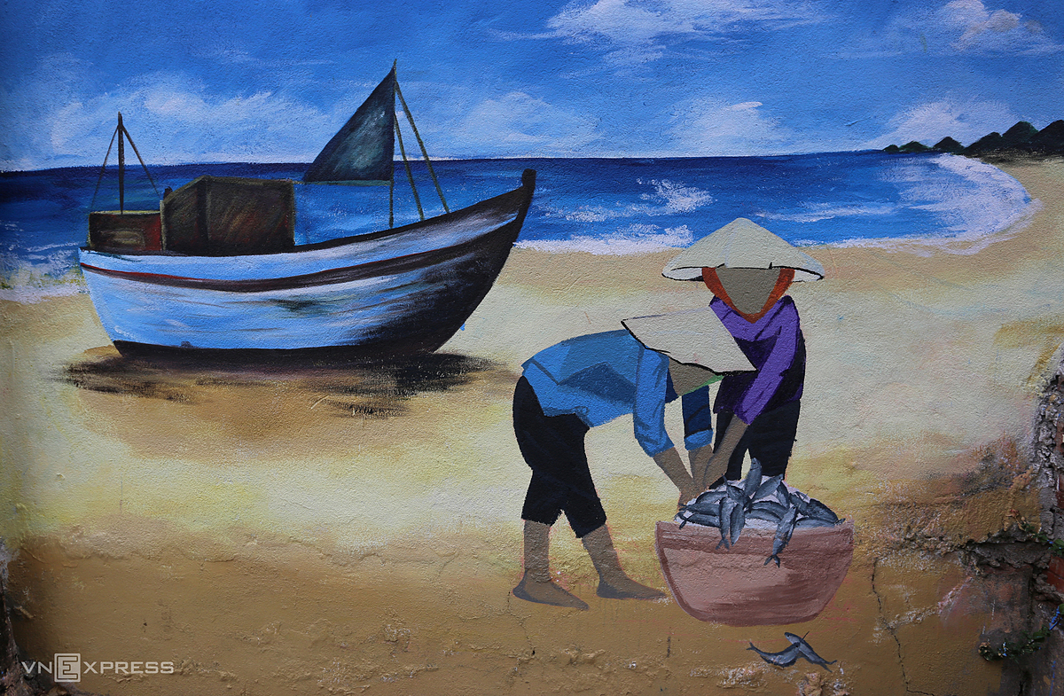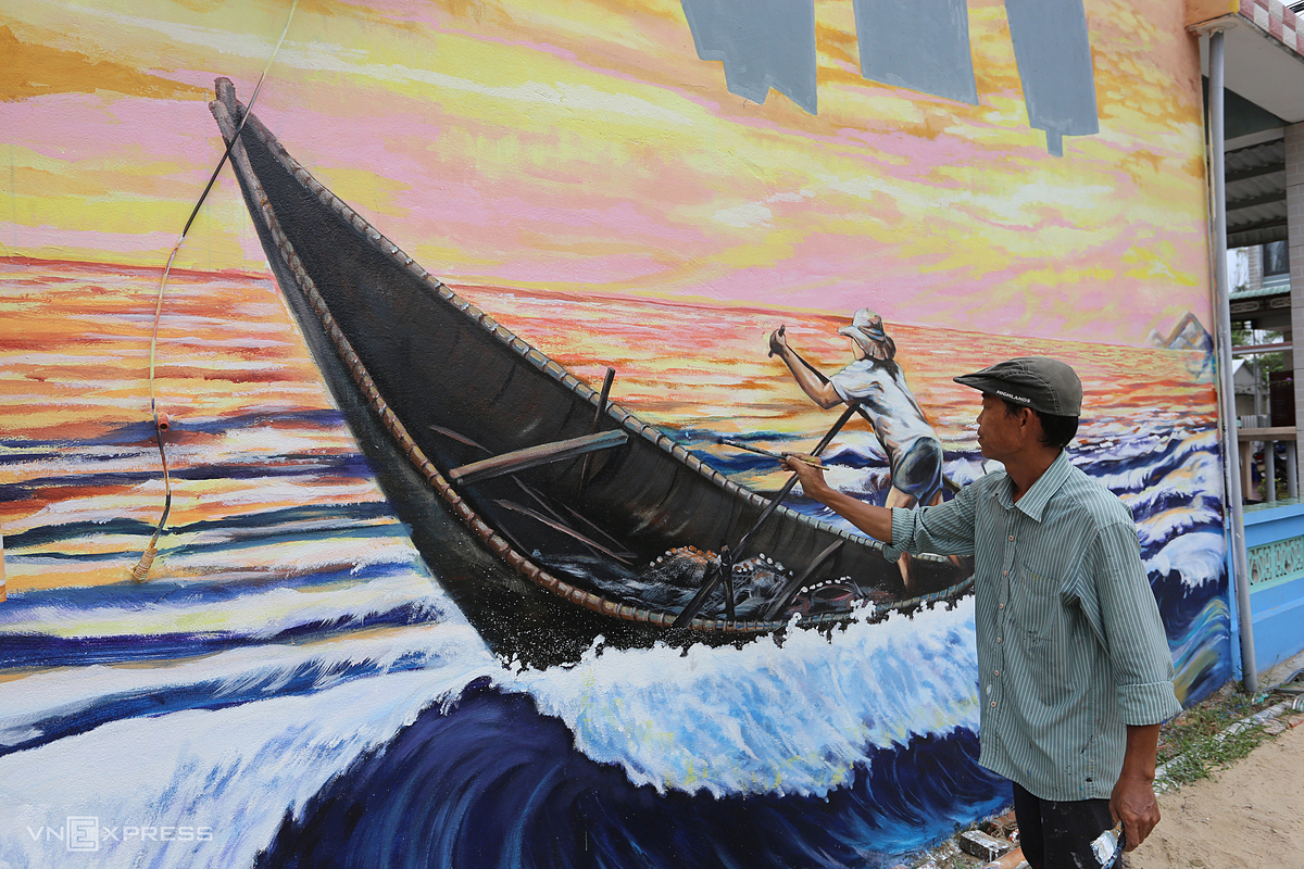 Painter Pham Dinh Hai works on a 15-meter-long mural depicting a fisherman setting out to sea. |