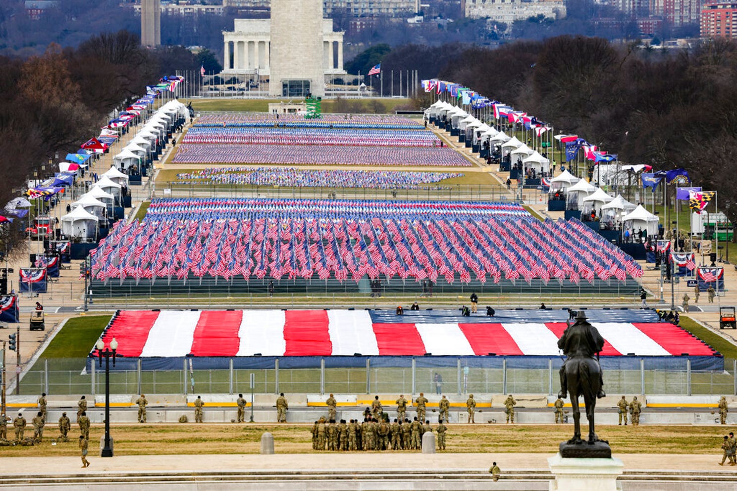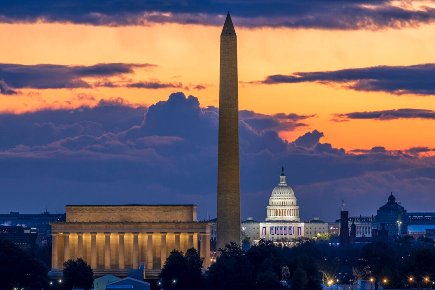 Dawn breaks behind the Lincoln Memorial, Washington Monument, and the U.S. Capitol on Inauguration Day in Washington, Wednesday, Jan. 20, 2021. President-elect Joe Biden will be sworn in as the 46th President of the United States of America at noon. Photo: J. DAVID AKE, AP |