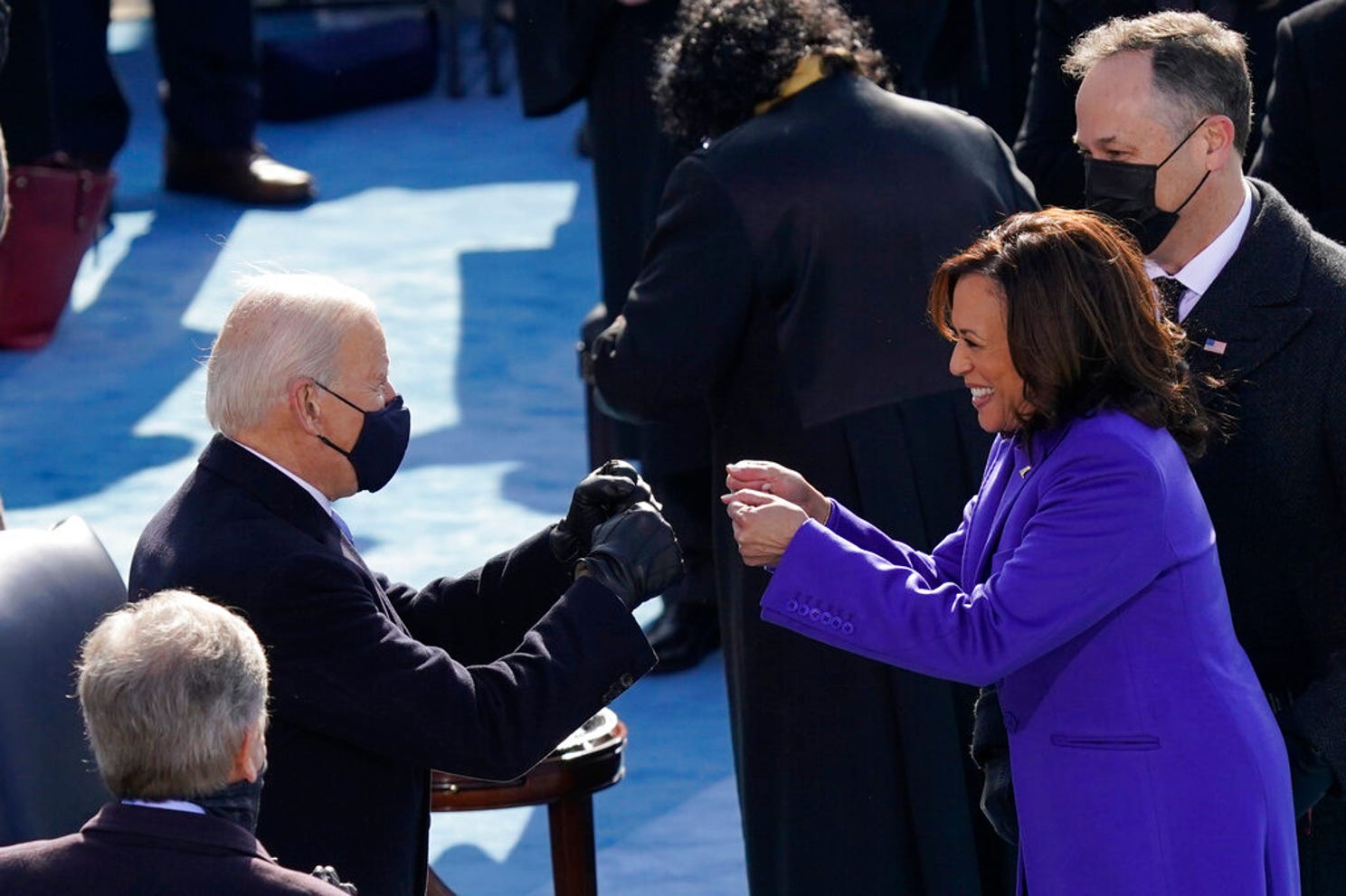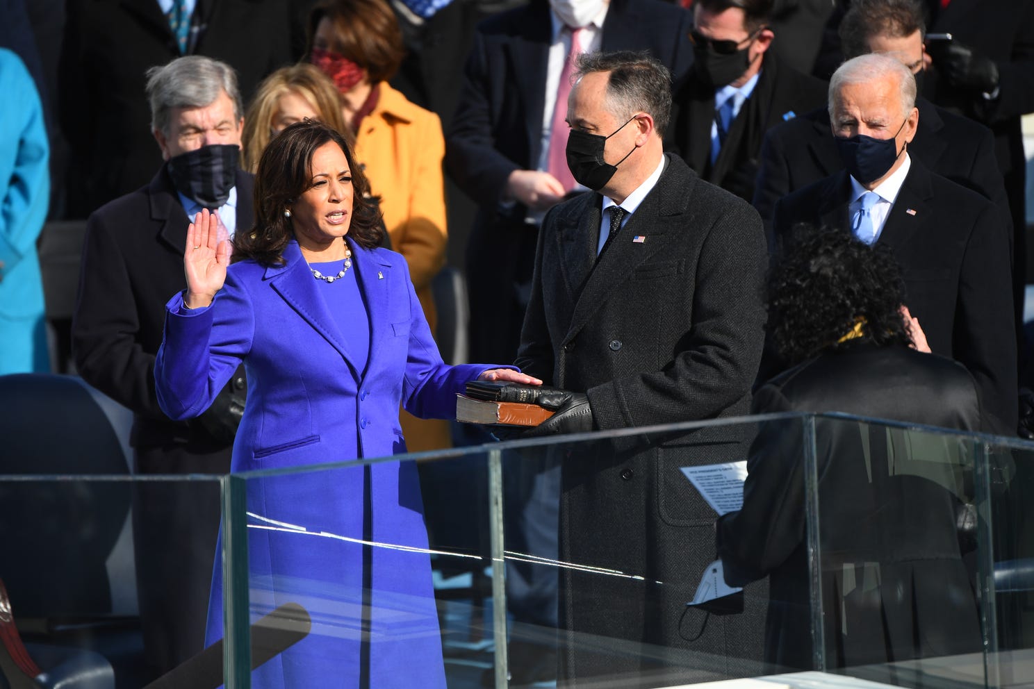 Kamala Harris is sworn in as vice president by Supreme Court Justice Sonia Sotomayor as her husband Doug Emhoff holds the Bible during the 59th Presidential Inauguration at the U.S. Capitol in Washington, Wednesday, Jan. 20, 2021. Photo: SAUL LOEB, AP |