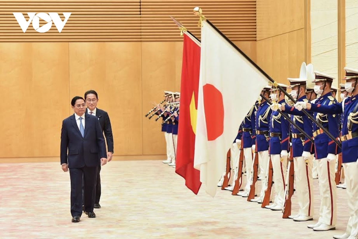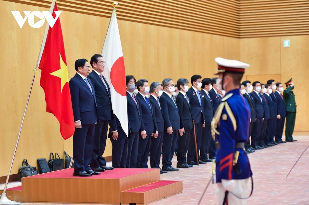 PM Chinh is warmly welcomed by PM Fumio Kishida at a ceremony held in Tokyo on November 24. |