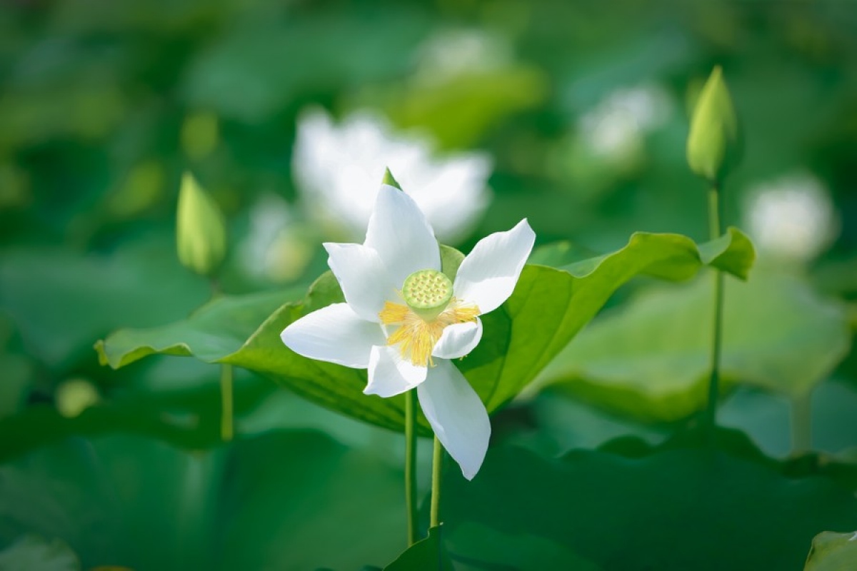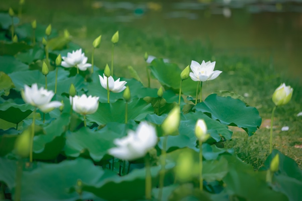 Each white lotus features thick petals and has a charming scent that is widely enjoyed around the pond.