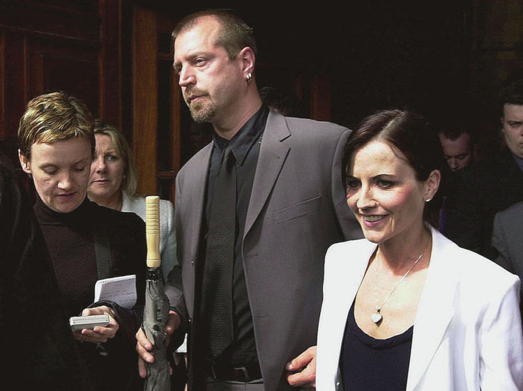 Dolores O'Riordan speaks to reporters outside the High Court in Dublin, Wednesday, April 28, 2004, after she and her then husband Don Burton, center, won the court case against them of alleged unfair dismissal by their nanny Joy Fahy. (AP Photo/John Cogill) |