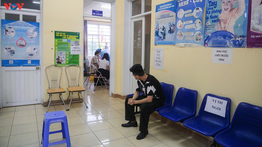 Residents strictly follow medical recommendations, sitting one to two metres apart while waiting for tests in Ha Long city. |