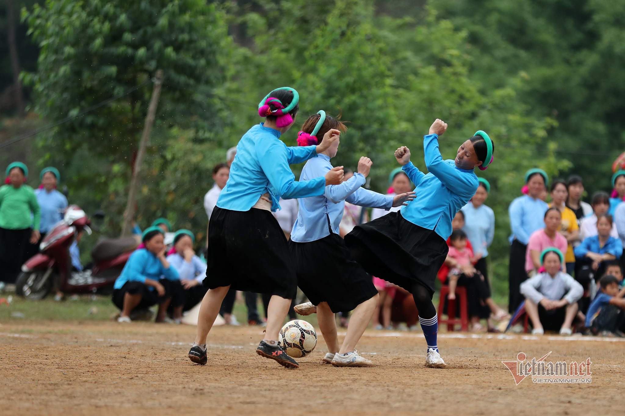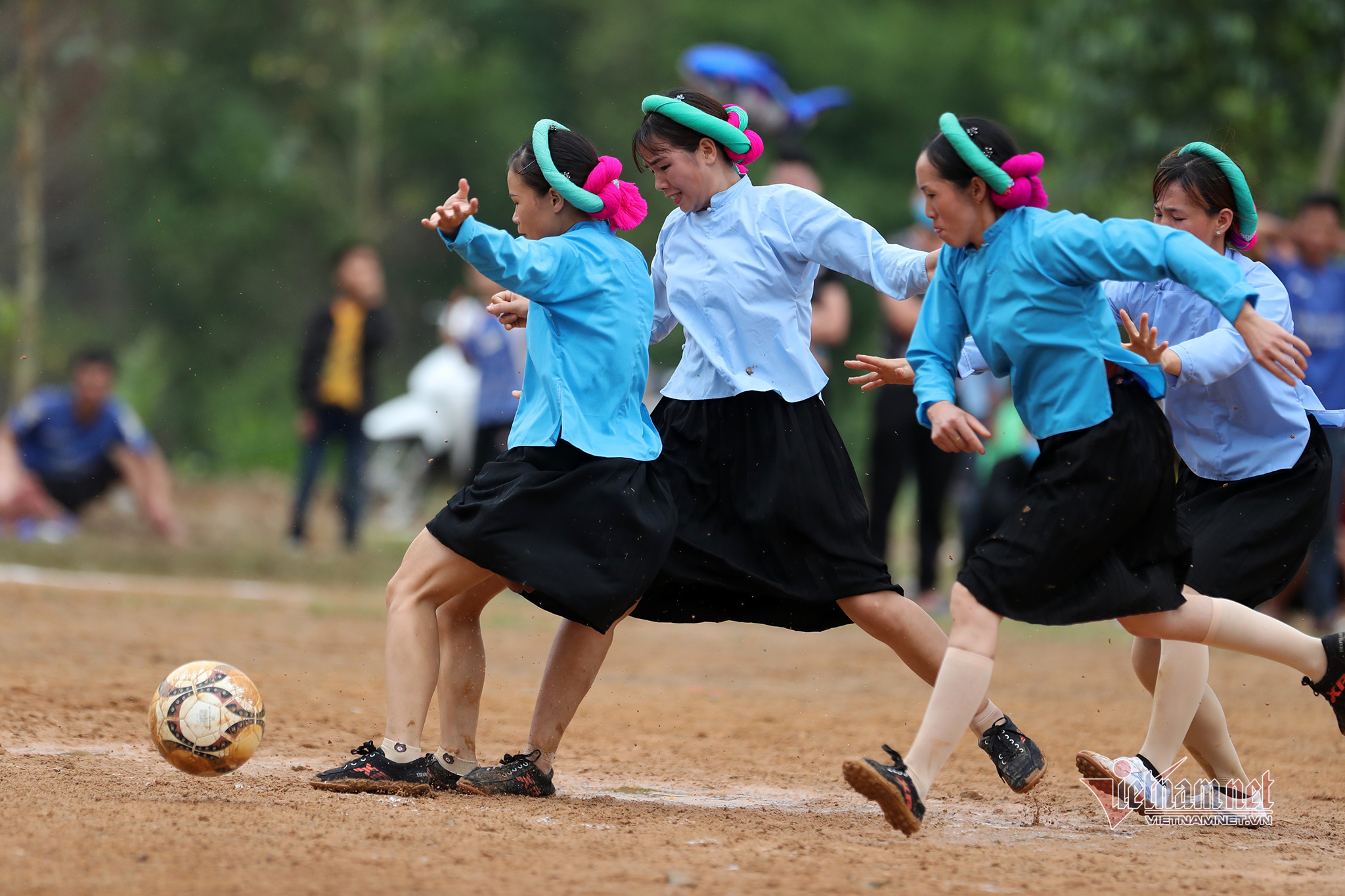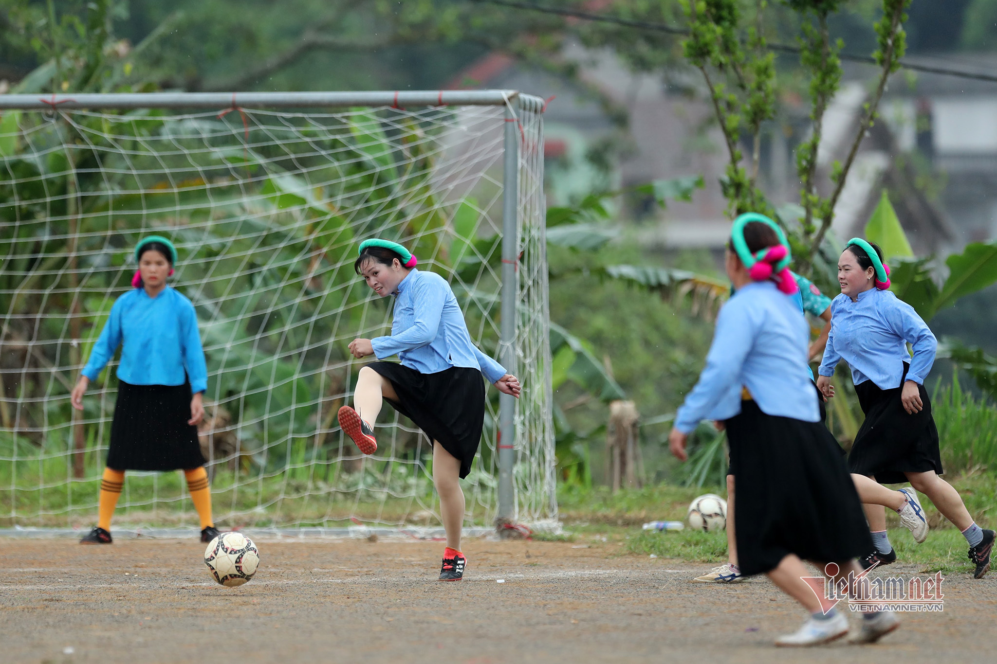 Women's football is popular in Vietnam but the image of young girls of the San Chi ethnic minority group in Huc Dong commune in traditional costumes and headscarves playing football is especially impressive.