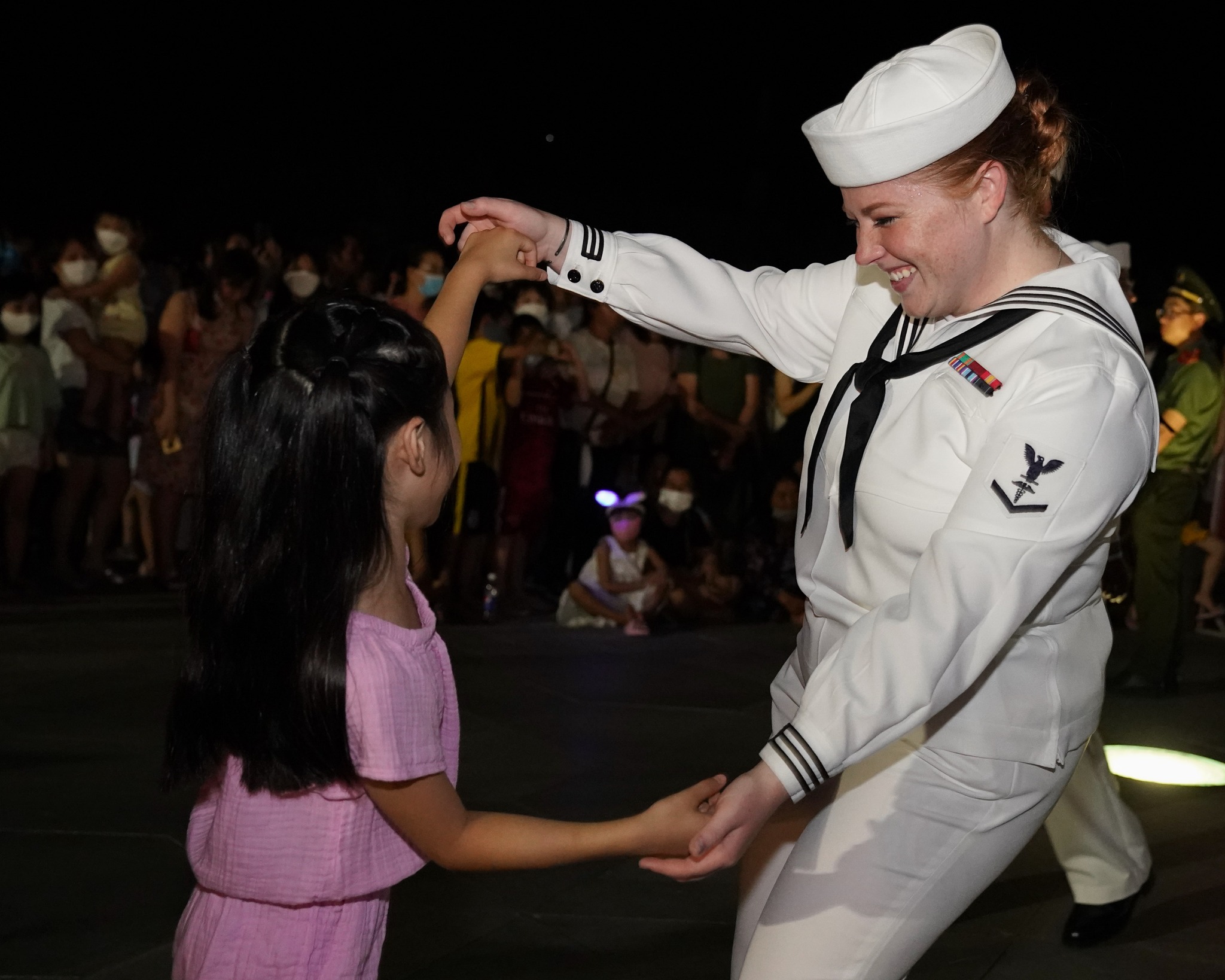 HN Hayley Malpass dances with a local child during the concert at the Pacific Partnership 2022 Opening Cermony. |