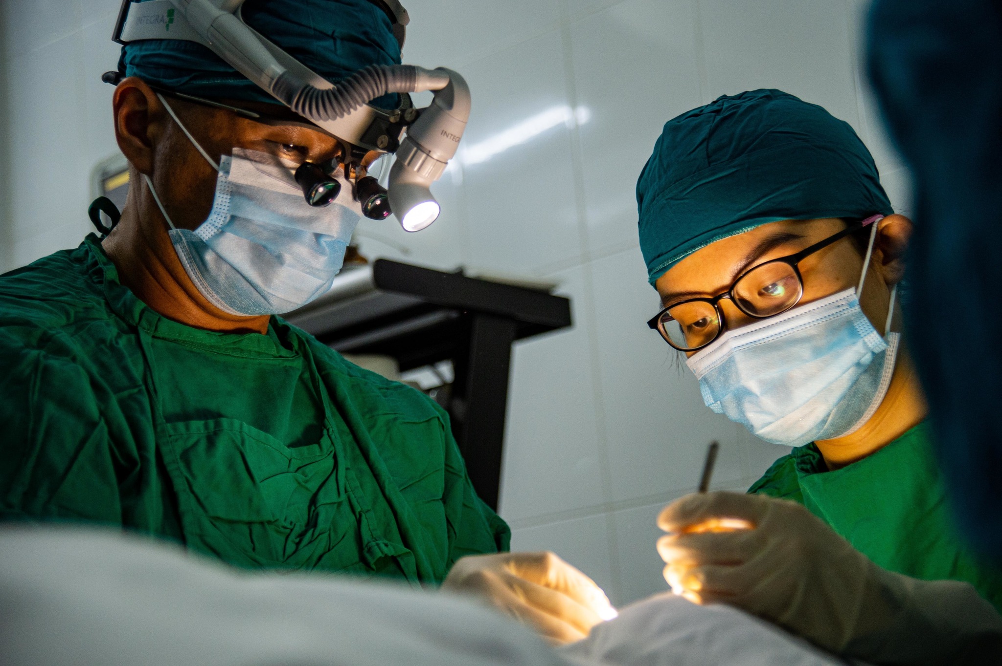 Cmdr. Tim Kim (left), an opthalmologist aboard Military Sealift Command hospital ship USNS Mercy (T-AH 19), and Huynh Nguyen Ngoc Trinh (right), a Vietnamese opthalmologist, perform eyelid reduction surgery on a Vietnamese patient at the Phu Yen Opthalmology Hospital during Pacific Partnership 2022. (U.S. Navy photo by Mass Communication Specialist 2nd Class Jacob Woitzel) |