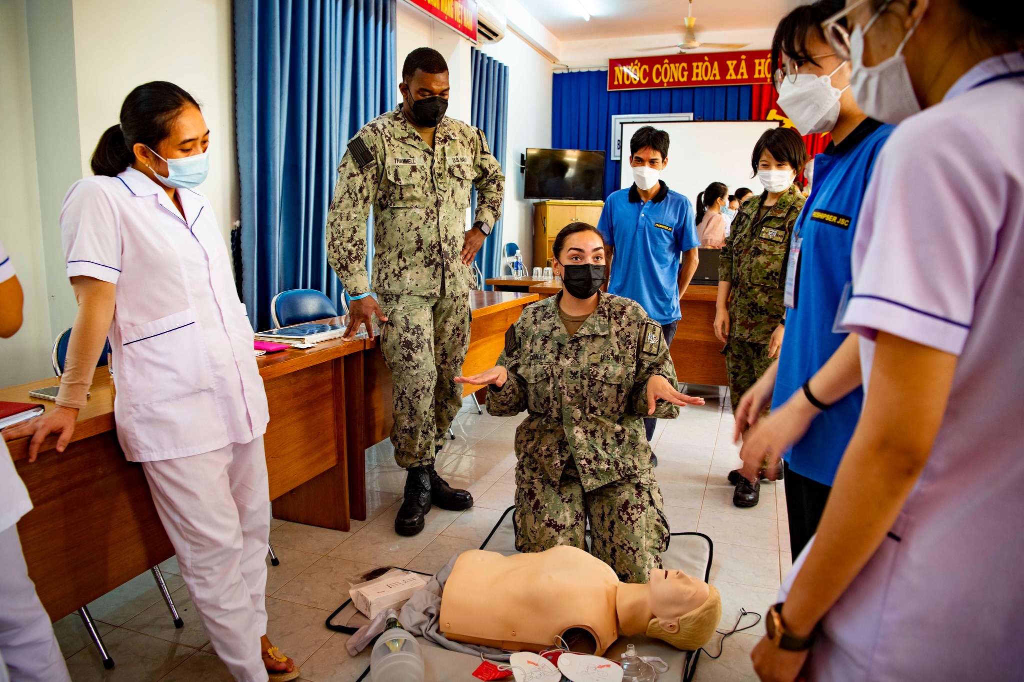 Hospital Corpsman 2nd Class Anne Marie Crumley, facilitates Basic Life Support subject matter expert exchange with Vietnamese medical professionals at the Traditional Medicine Hospital in Phu Yen during Pacific Partnership 2022. (U.S. Navy photo by Mass Communication Specialist 1st Class Shamira Purifoy) |