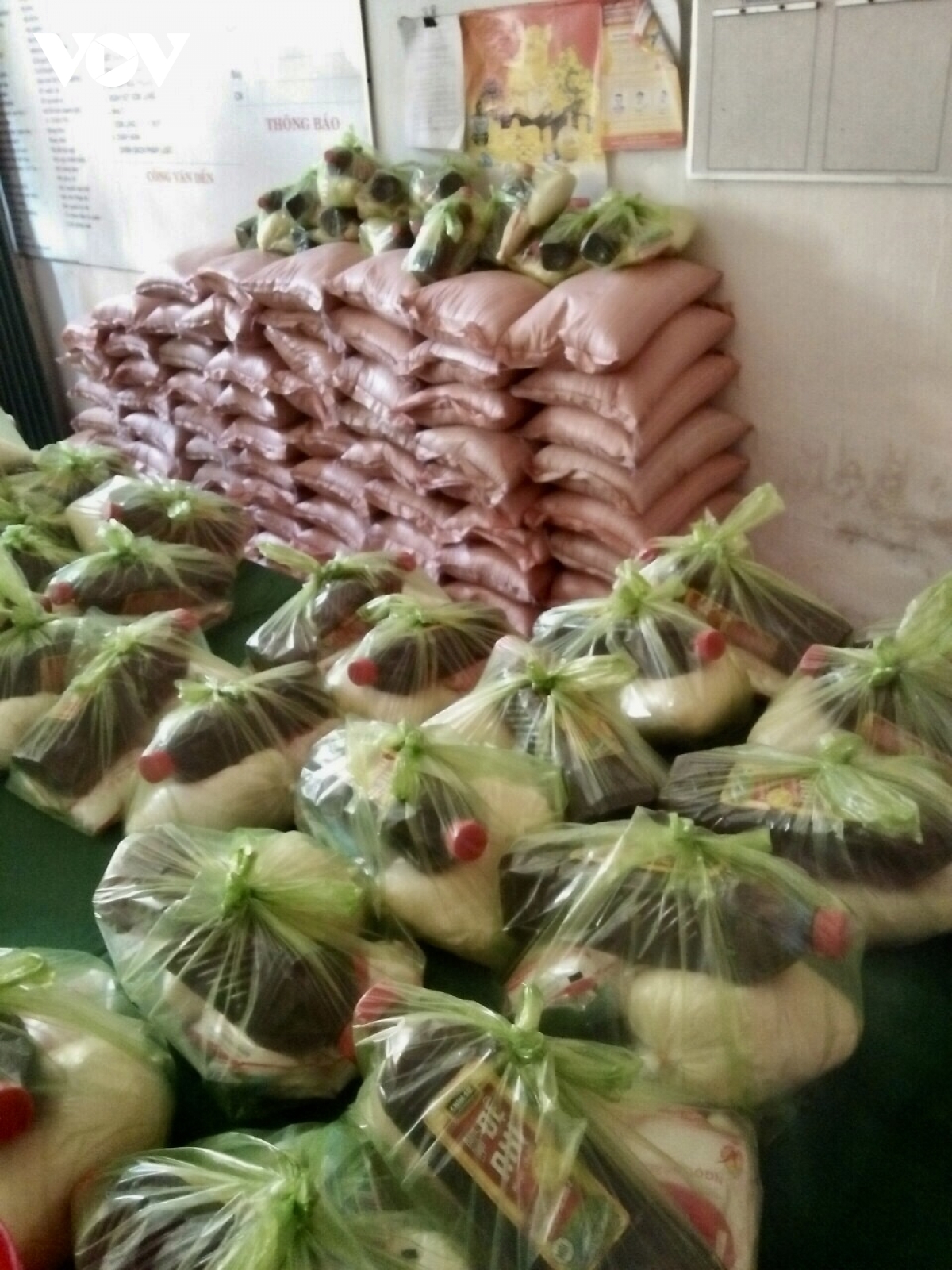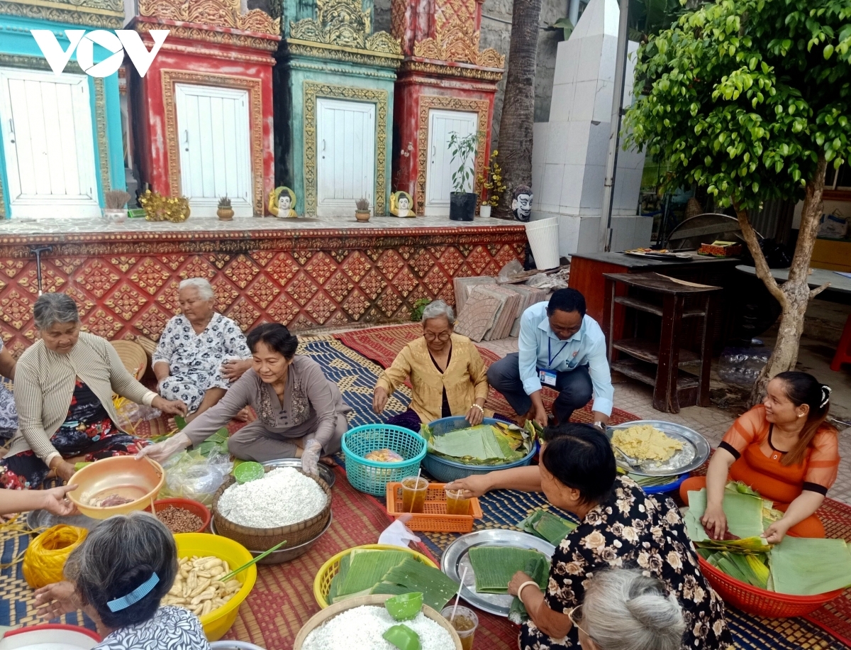 Khmer women come together to make several kinds of cakes, including banh tet, a sticky rice cake with pork and green bean filling, and banh it, sticky rice cake with coconut and green bean filling. |