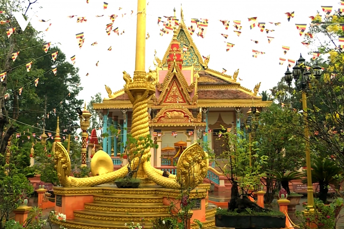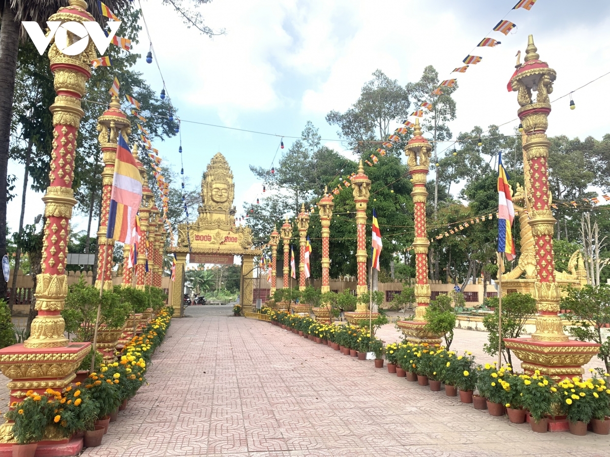 Each of the Khmer pagodas has prominent displays of flowers and flags. |