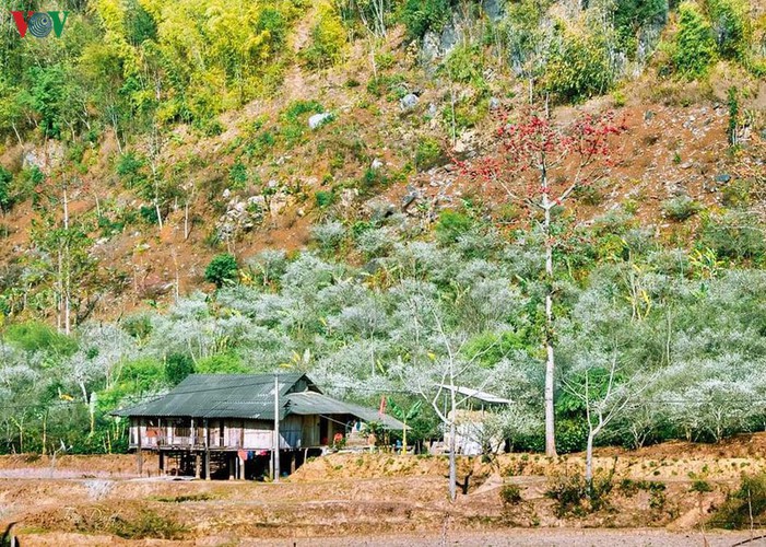 The red colour of bombax ceiba flowers and the pure white of the apricot and plum flowers helps to brighten up the homes of Thai ethnic minority people