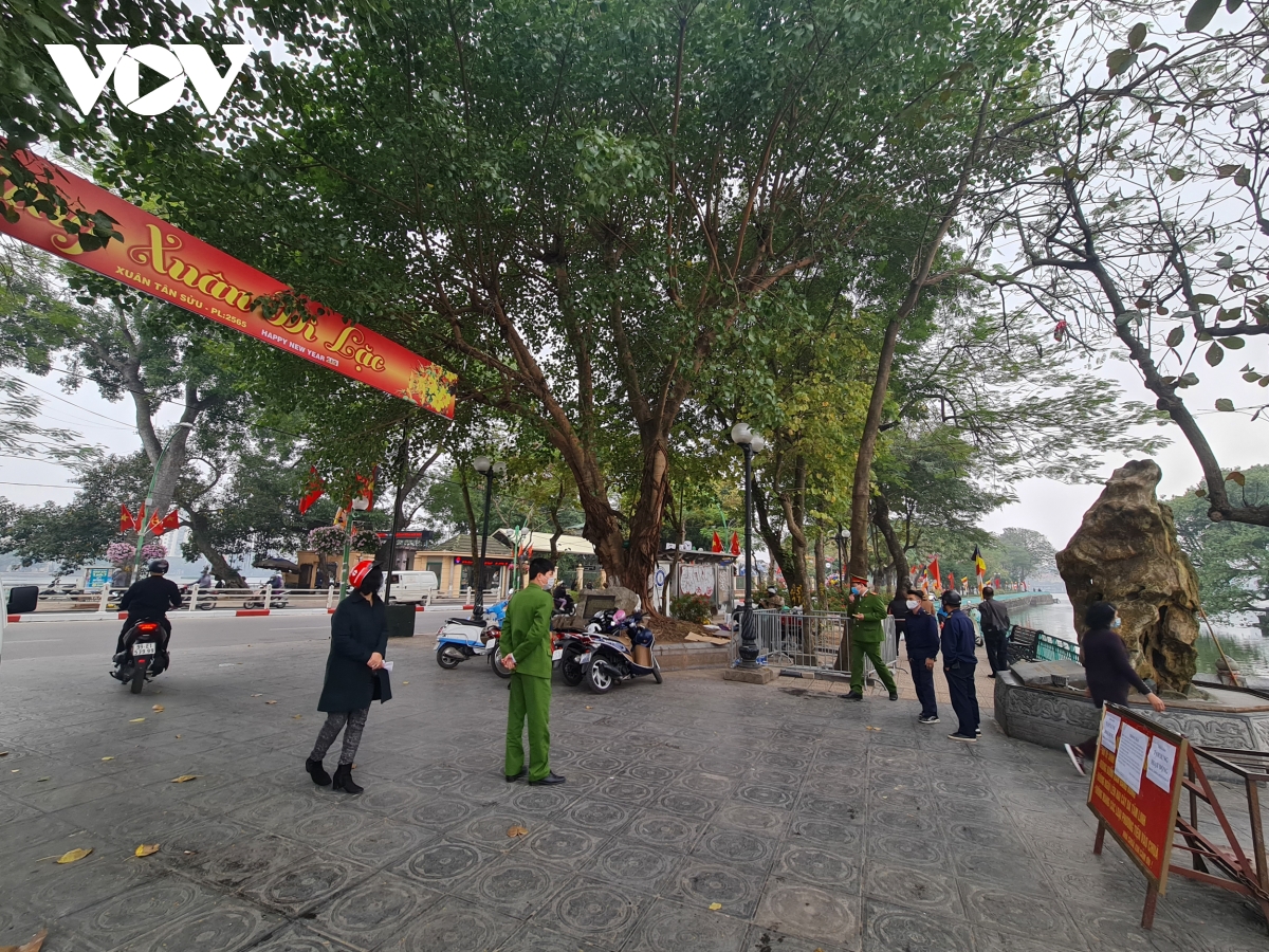 Security forces are deployed to prevent crowding in front of Tran Quoc Pagoda. |