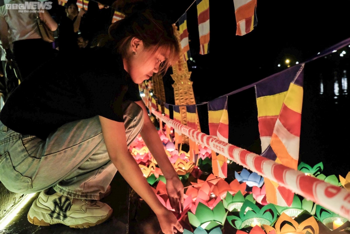 Buddhist followers drop the lotus lanterns from a bridge as a way of showing gratitude to their parents.