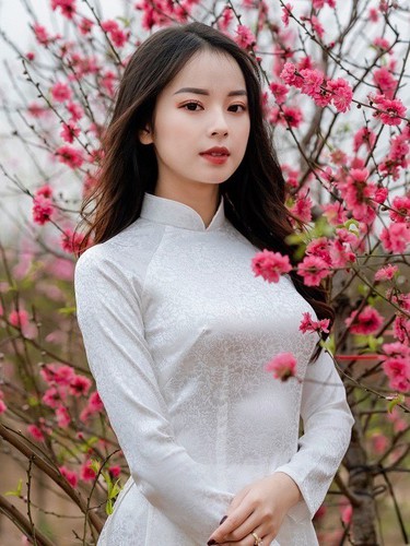 A young girl wears an Ao Dai, a traditional long dress, whilst she poses for photo in the garden.