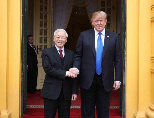 Party General Secretary and State President Nguyen Phu Trong meets US President Donald Trump in Hanoi on Wednesday.