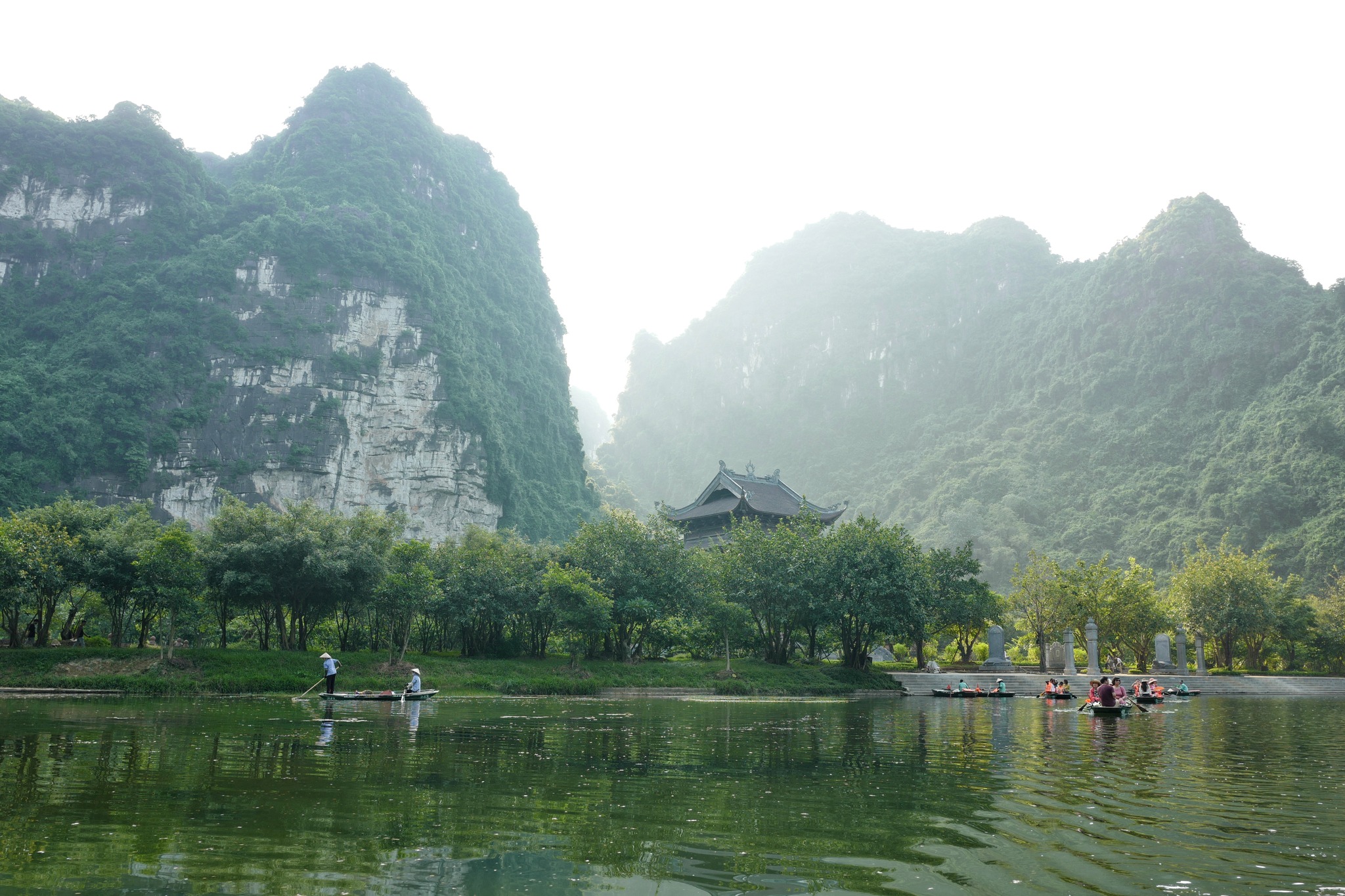 Temples and pagodas dot the Trang An Landscape Complex, hidden in the lush greenery and towering cliffs. |