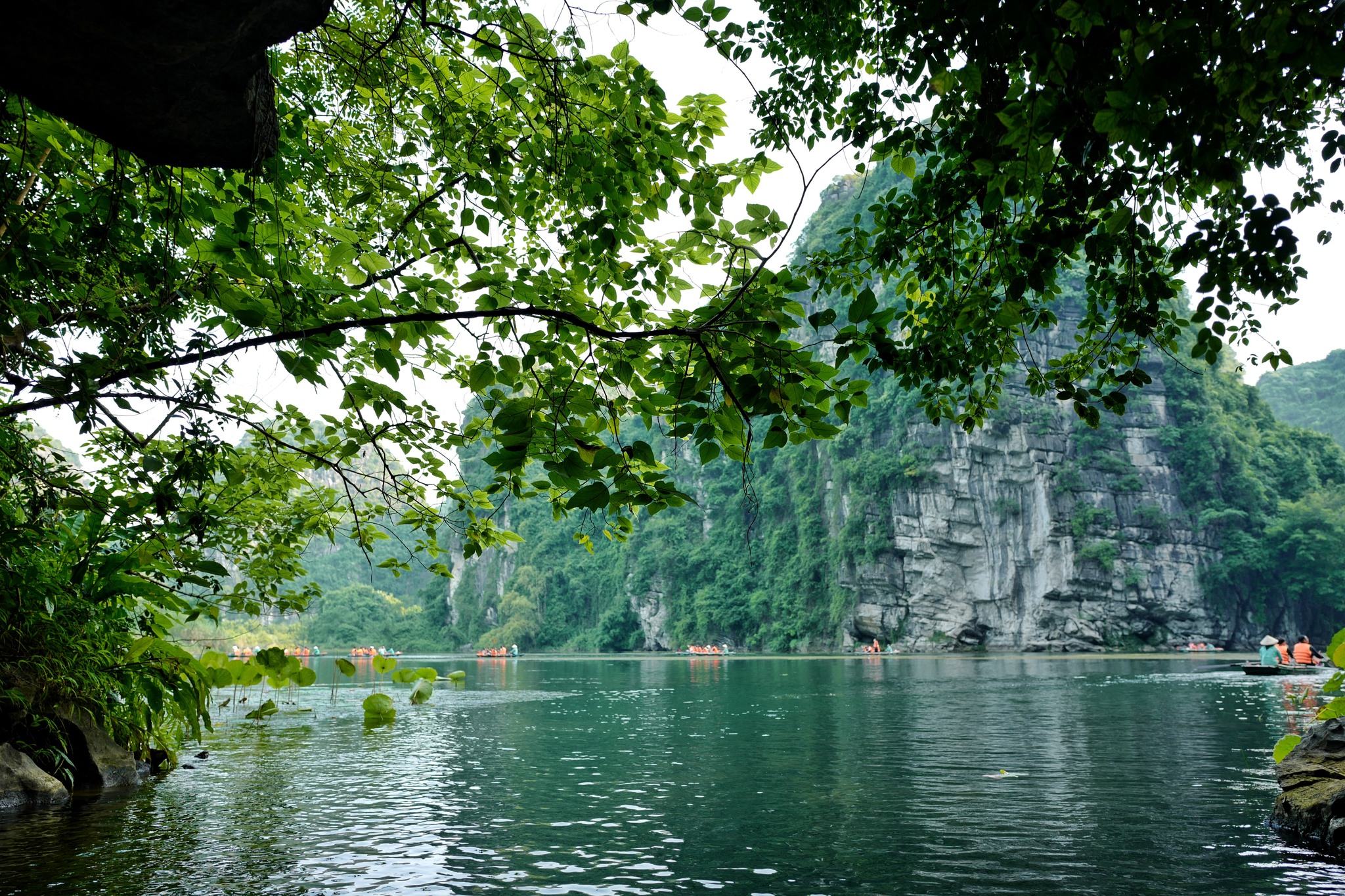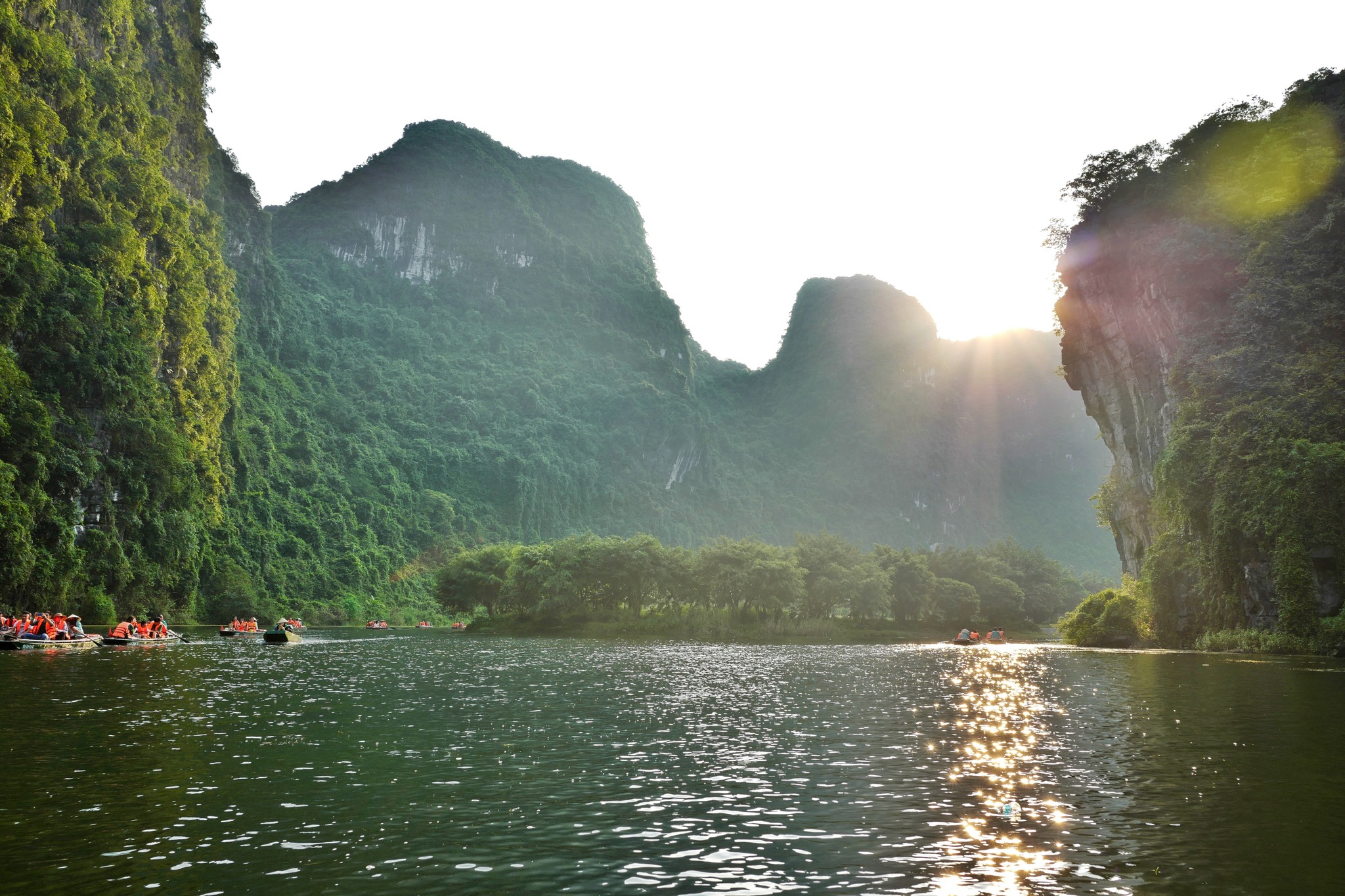 Small boats glide through Trang An’s intricate network of subterranean waterways, offering visitors a glimpse of its karst formations. |