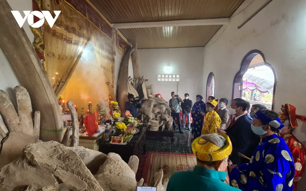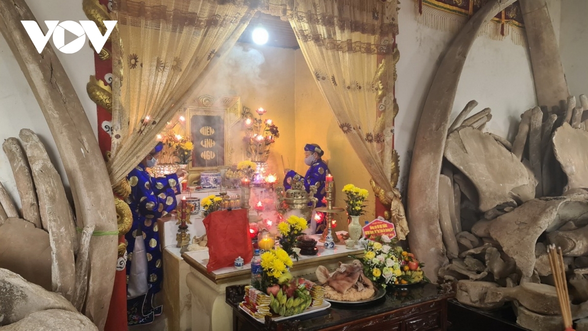 ![]() The highlight of the festival is the worshiping of the whale skeletons which are maintained at the Whale Worshiping Shrine in Canh Duong village. |