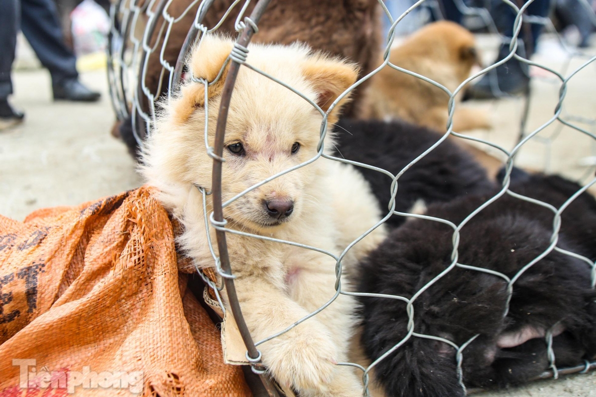 Hundreds of dogs of all sizes and colors are put up for sale at the market.