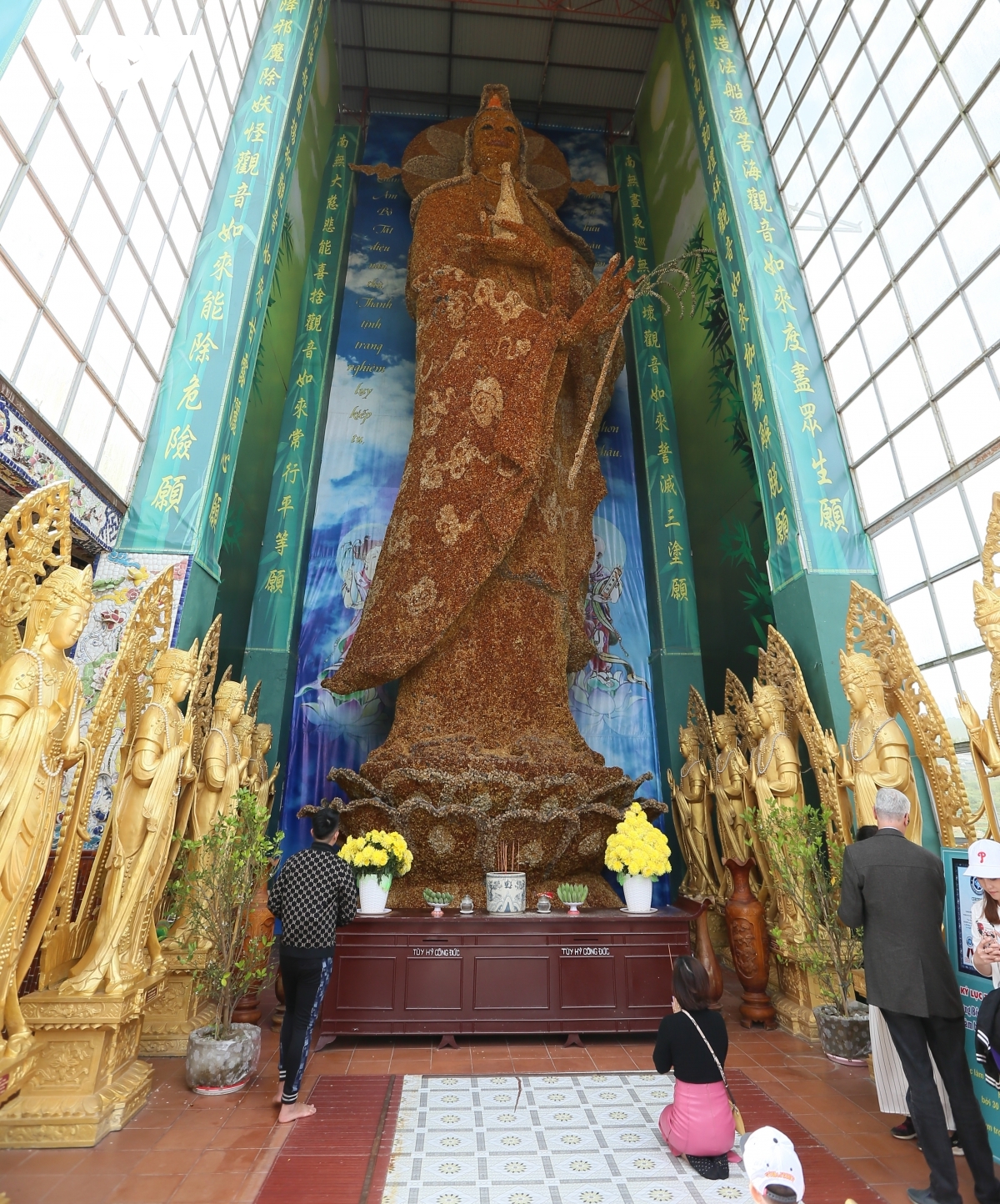 | The 17-meter-high strawflower-made Goddess of Mercy statue placed in the seven-storey bell tower of Linh Phuoc Pagoda is mounted from 650,000 strawflowers, a feat that was recognized as a world record by the World Record Union in 2017. |
