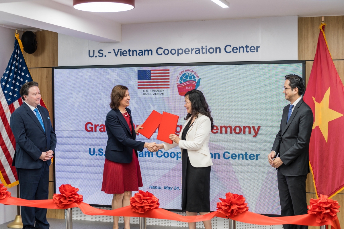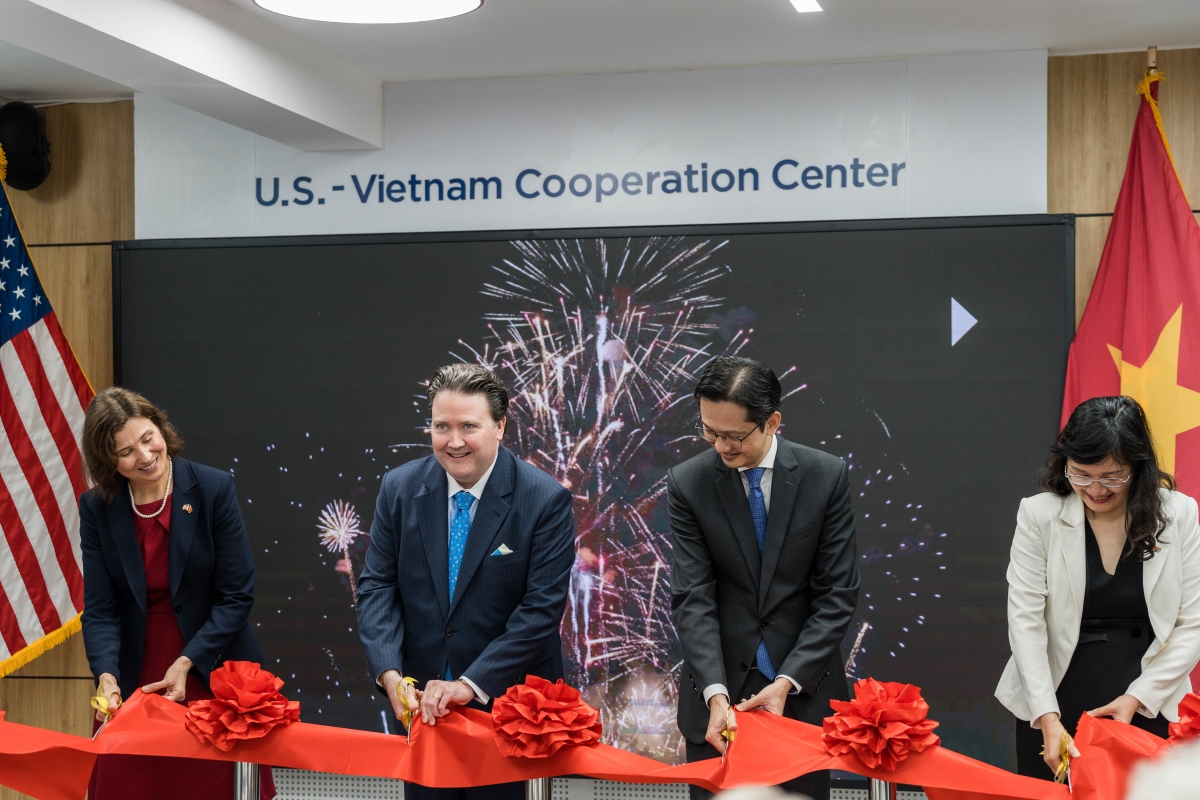 US Ambassador Marc Knapper and Assistant Foreign Minister Do Hung Viet, Acting President of Diplomatic Academy of Vietnam Pham Lan Dung, and Counselor for Public Affairs Pamnella DeVolder opened the center after a ribbon cutting ceremony at the Diplomatic Academy of Vietnam (DAV) on 69 Chua Lang Street in Hanoi.