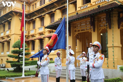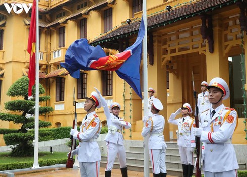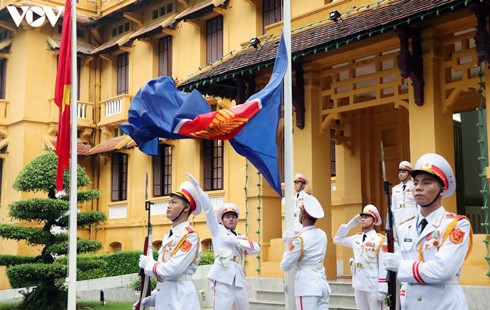 The ASEAN flag-hoisting ceremony take place in front of the Ministry of Foreign Affairs headquarters in Hanoi.
