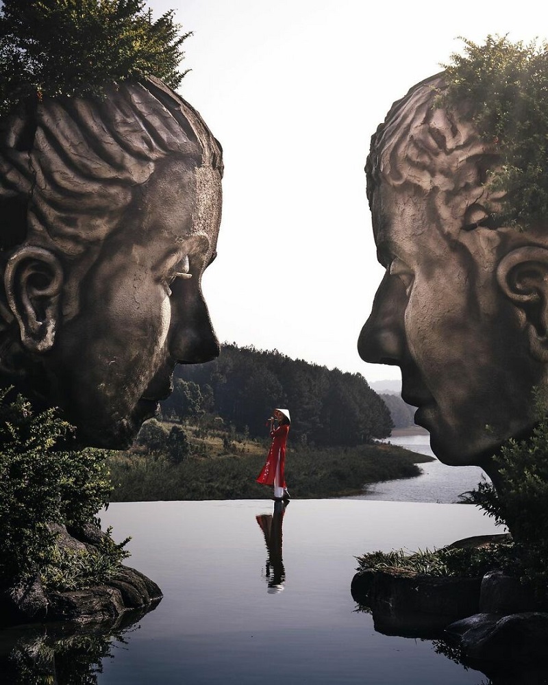 A girl in "ao dai" is playing the flute between the two outstanding sculptures. The photo was taken by Ryosuke at the Clay Tunnel tourist site in Dalat City, Lam Dong Province. |