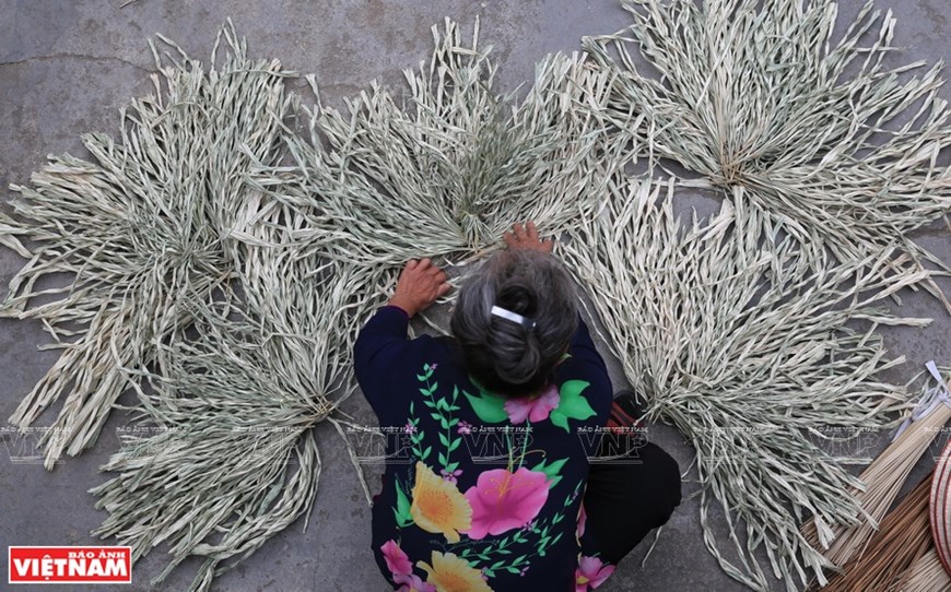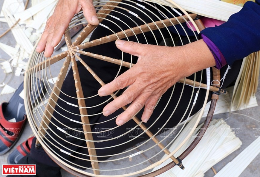 Craft women meticulously arrange the leaves and sew the conical hats. (Photo: VNP/VNA)