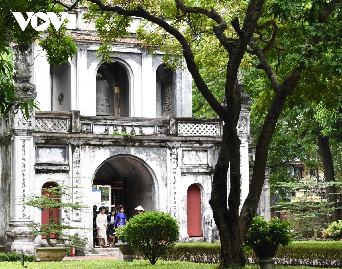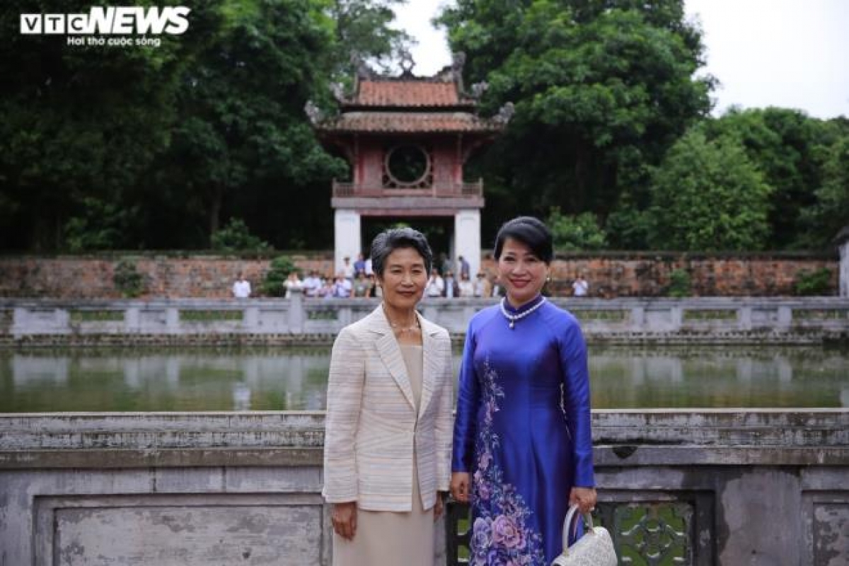 The Japanese PM’s wife joins PM Phuc’s wife as the pair take a photo in front of the Khue Van Cac, also known as the Pavilion of Constellation of Literature.