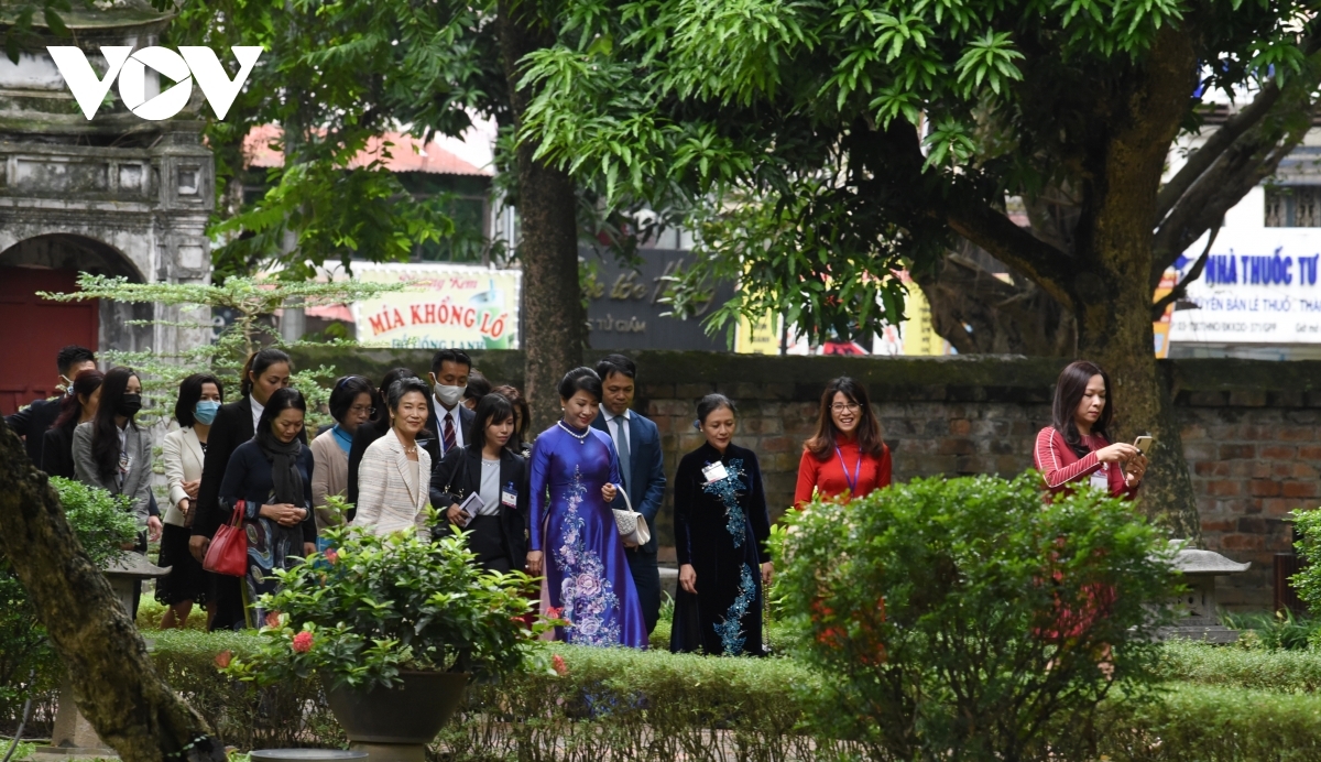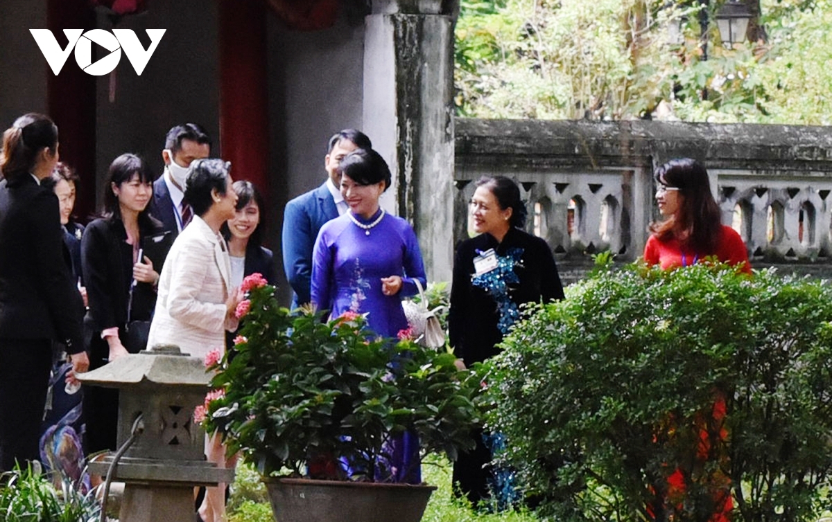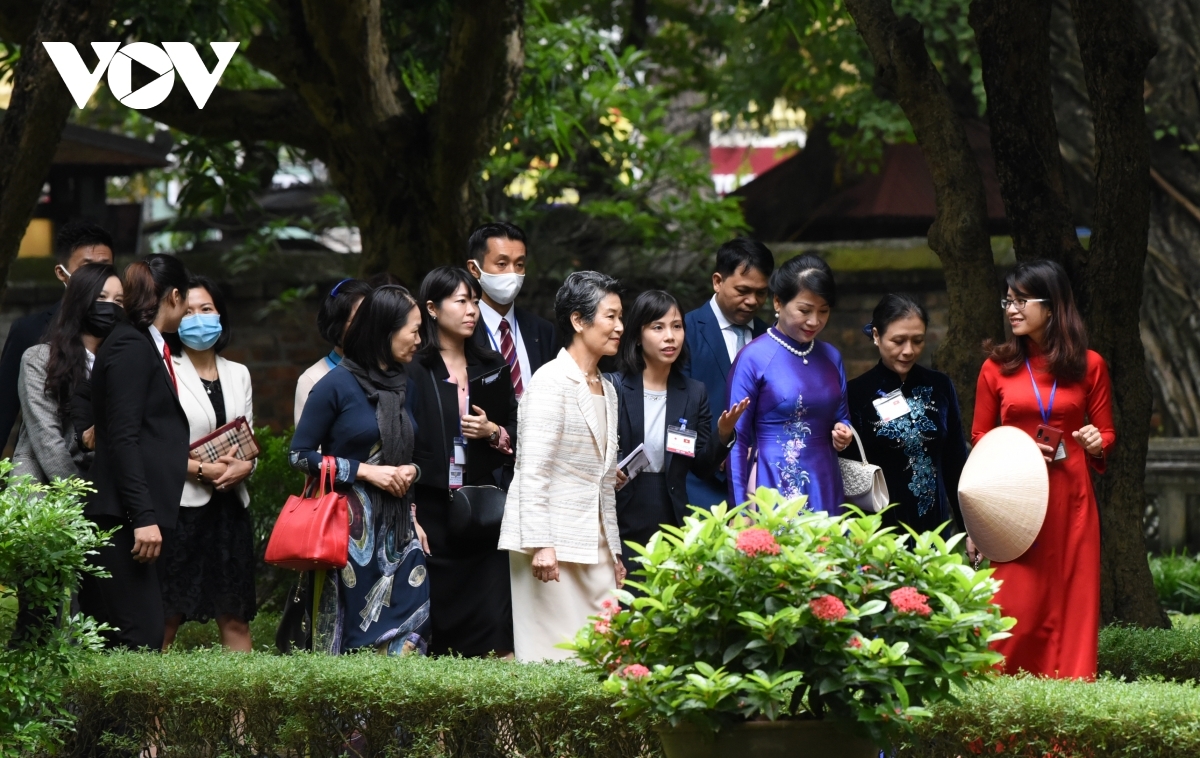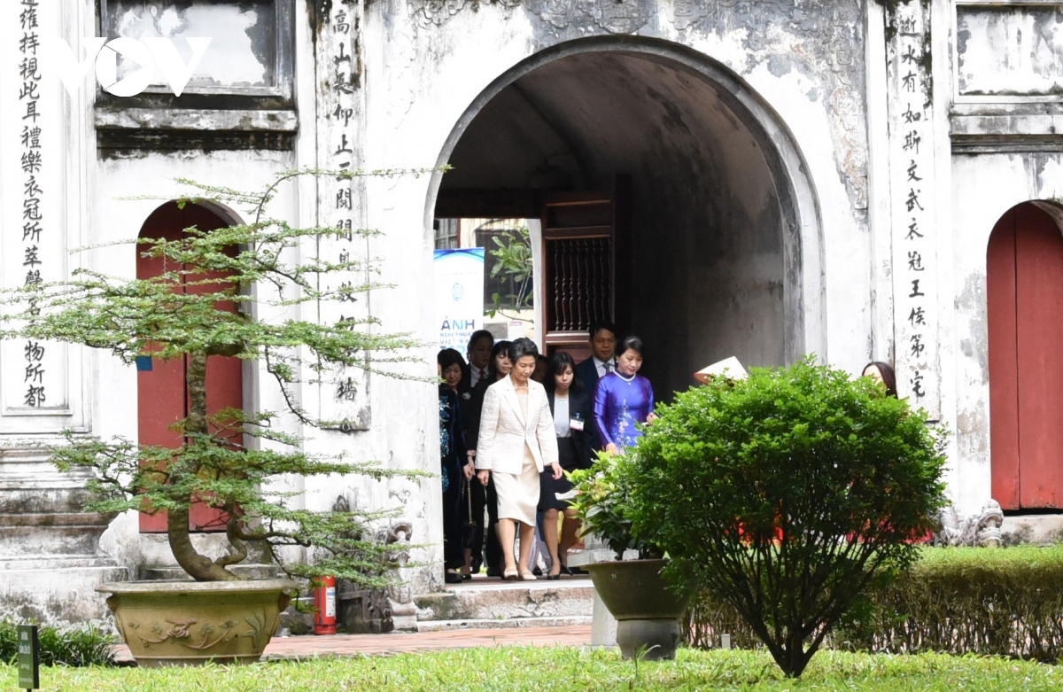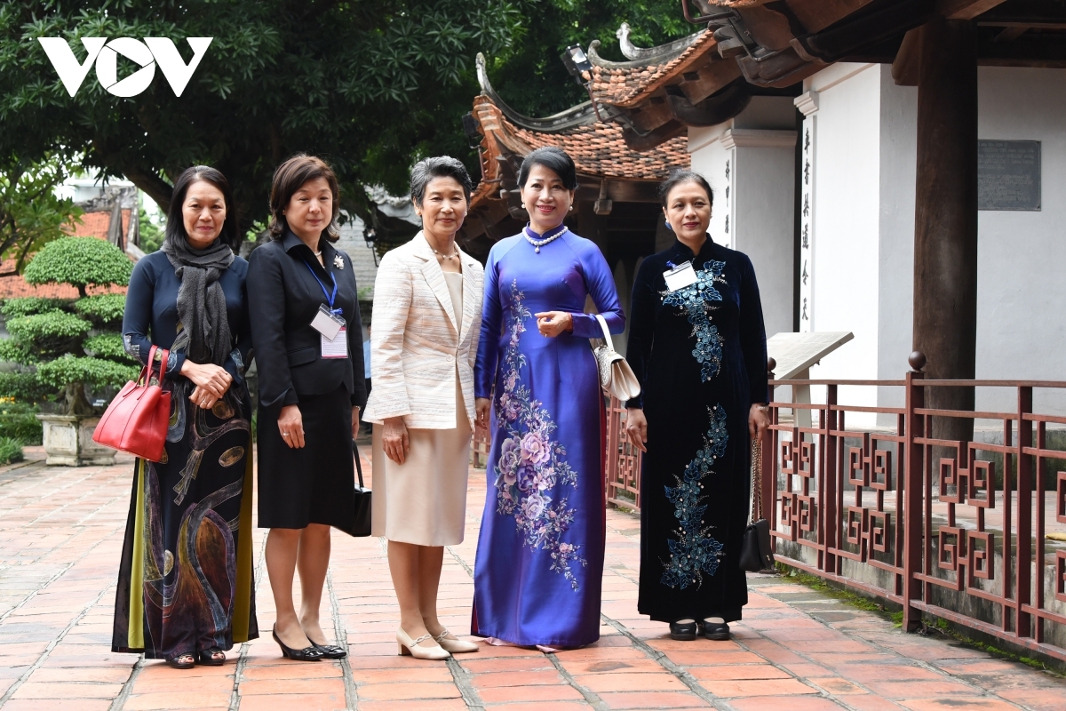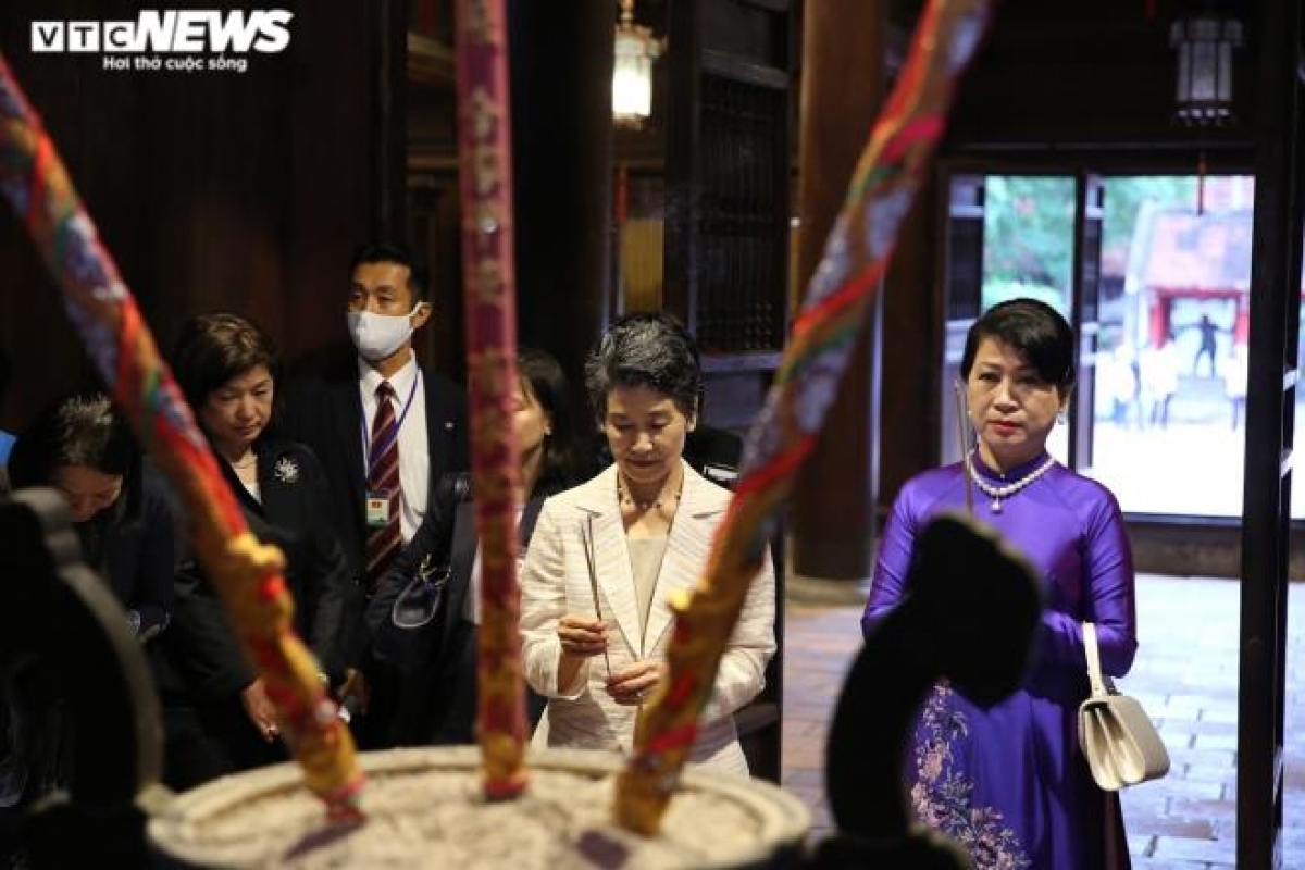 Following the welcome ceremony held at the Presidential Palace in the capital, the Japanese PM’s wife Suga Mariko goes on a visit to the Temple of Literature alongside Tran Thi Nguyet Thu, Prime Minister Nguyen Xuan Phuc’s wife.