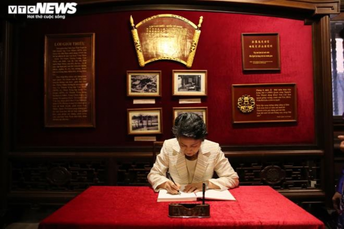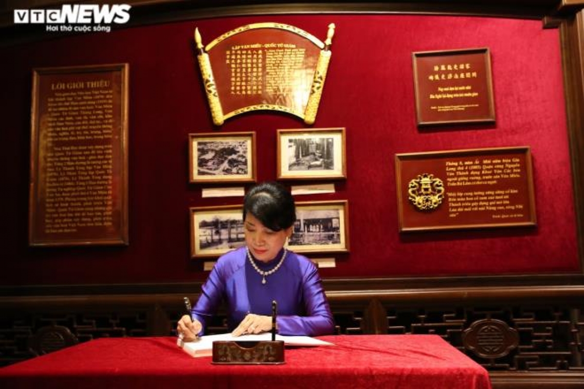 Mrs. Tran Thi Nguyet Thu also writes in the guestbook at the Temple of Literature.