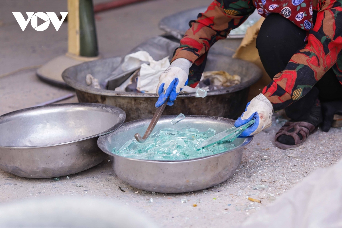 | Tran Van Duyen, 50, who has around 20 years of experience in glass making, shares that the village only has three glass kilns today. |