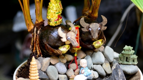 Artist transforms coconut shells into buffalo-shaped Tet penjings
