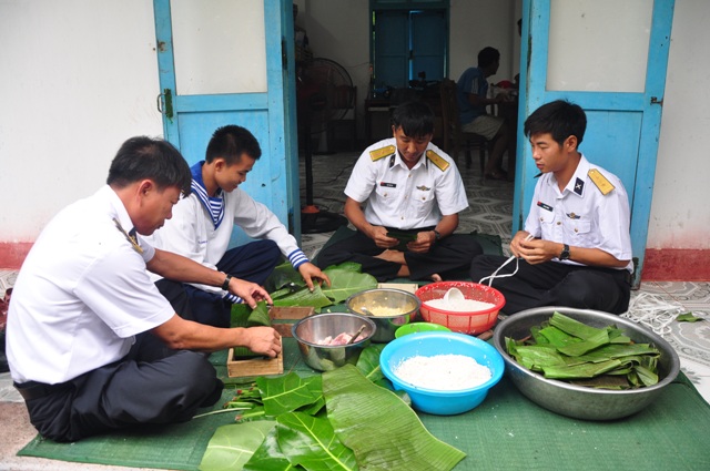 Today, soldiers on Nam Yet Island, Sinh Ton commune, began to wrap pork-pies and ‘chung’ cakes. Preparations of sticky rice, green beans, pork, cat’s ears, and wrapping leaves were made a couple of days in advance. Although this year, many ‘dong’ leaves were sent from the mainland, soldiers here prefer to wrap ‘chung’ cakes in the leaves of square almond trees grown on the Island.