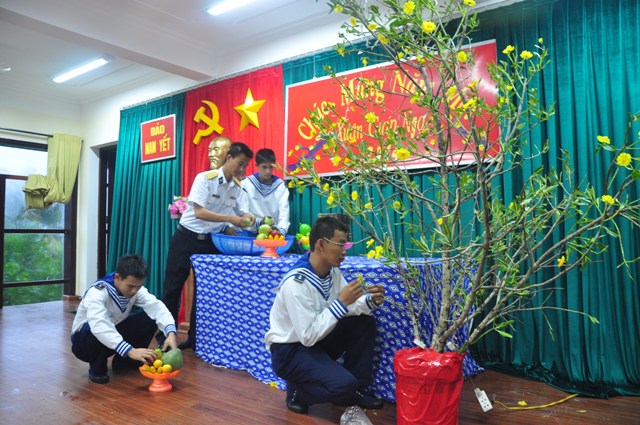 These days, soldiers and military staff are repairing barracks decorating them with posters and hanging lights on square almond trees. O Son Ca Island, soldiers are gathering at the local Culture House to practice art performances and prepare a five-fruit tray for the New Year’s Eve party. Lieutenant-colonel Do The Tuyen, the Island’s commander, says:
