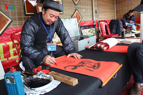 People enjoy calligraphy demonstration at the Temple of Literature, Hanoi. (Photo: VOV)