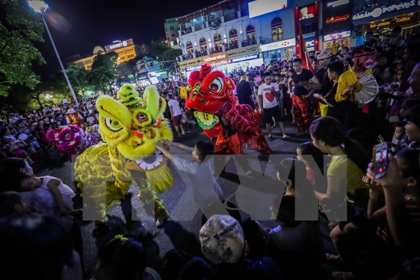 A lion dance welcomes the lunar New Year in Hanoi's pedestrian street. (Photo: VNA)