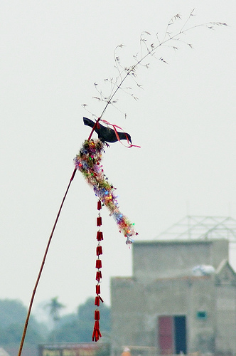 Vietnamese people erect a Neu tree in front of their house to show off their land holdings and mark the border of their house. On the top of the bamboo tree, they often hang a snatch of pineapple leaves, chicken feathers and a circle of New Year cards made of bamboo and do (poonah) paper. The decoration on the Neu trees varies between regions and periods. According to Mr. Hong, the circle of bamboo cards symbolizes happiness and chicken feathers represent holy birds with powers that can help the family. On the Neu tree some people also hang an effigy made of straw or paper called Mr. Neu: “We hang an effigy on the Neu tree. They decorate the effigy differently each year. They may color the effigy to give him a new style. Under the Neu tree, we plant some thorn trees to dispel evil”.