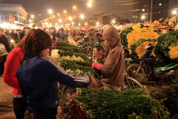 Quang An flower market originated from a temporary market in Nhat Tan district established to sell flowers grown at some well-known flower villages by West Lake such as Nhat Tan, Quang Ba. In 1996, when Tay Ho district was set up, the market was moved to its present place in Quang An district. Prior to Tet, flowers of different kinds are transported from other traditional flower villages on the outskirts of Hanoi such as Soc Son, Me Linh, Dong Anh and from even further areas like Sapa and Da Lat. In the North of Vietnam, the spring is the season of flowers. So, flowers of different kinds can be found here: from low-cost flowers like dahlias, and daisies to expensive ones like roses, orchids, and violet. Flowers of all kinds, all are in full blossom at this time of year. Quang An flower market is a main market from where flowers are distributed to every where in the city. The market is open at night to early morning, except for Tet holidays. Most of the buyers are wholesale dealers. Nguyen Thi Van is a regular customer. “I come from An Duong. I come here at 5 a.m everyday to buy flowers. Then I resell them at the local market or peddle them in the streets in Hanoi.”