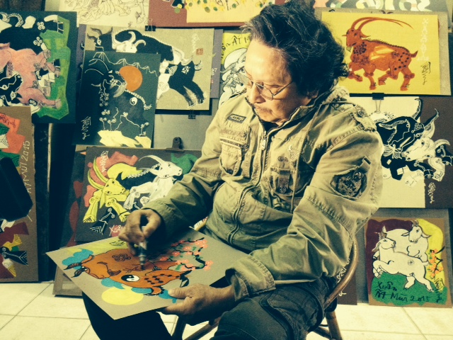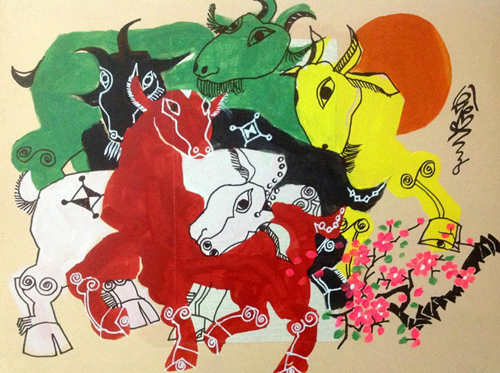 Dung has brought all of those ideas to his paintings. Most notably in Dung’s paintings are ones about family of goats, a goat mother and her child, and a couple of goats evoking the atmosphere of happiness and fertility. The strength and power are shown in the paintings of a top-ranking general Goat or a billy-goat standing undauntedly on the top of the mountain. Dung said that besides the snake, dog and mouse, the goat is one zodiac animal which is difficult to paint, so he must spend a lot of time thinking of how to make his special and vivid: “It is difficult to create shape for the goat in paintings. But with the beard and horn, it is a little bit easier than the mouse and the dog. Of my paintings of goats, the painting on those with the five elements of the universe, representing wood, earth, water, fire and metal, took me the most time. Instead of drawing one, I have to paint five goats with different colors and shapes representing the five elements. I also included the factors of yin and yang to bring an atmosphere of happiness and fertility to the painting”.