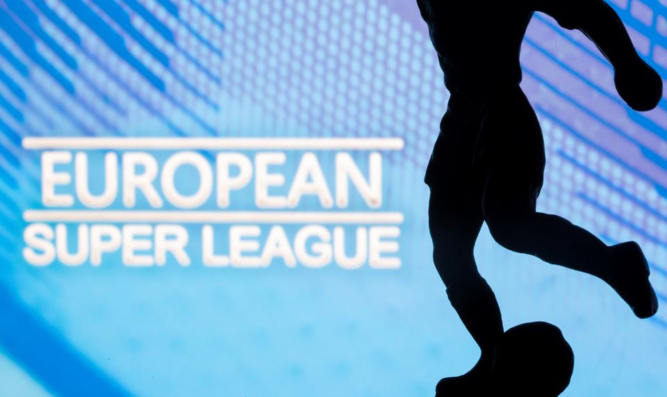 A metal figure of a football player with a ball is seen in front of the words "European Super League" in this illustration taken April 20, 2021. (Photo: REUTERS) |