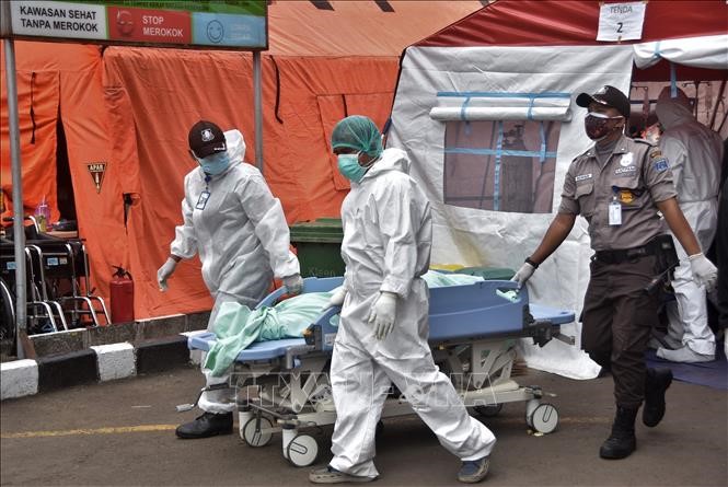 Medical staff transfer a patient who died from COVID-19 at a hospital in Bekasi, Indonesia. (Photo: AFP/VNA) |