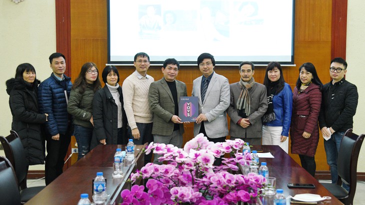 Reporter Hoang Huong hands over the portrait and a recorded interview with Trinh Thi Ngo to Huynh Thang Long, Deputy Director of VOV's Program Production and Archive Center. (Photo: VOV5) |
