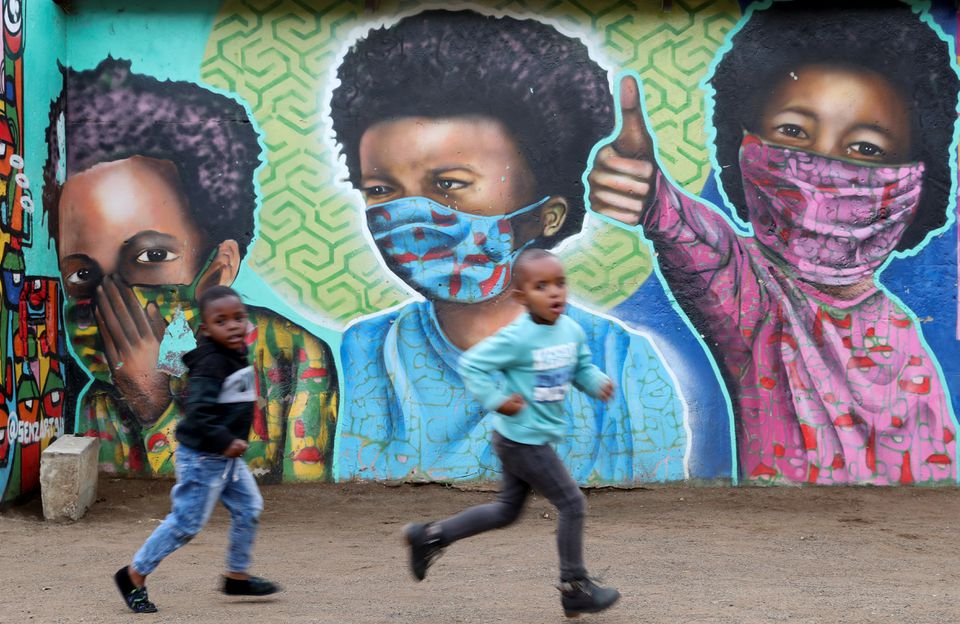 Boys run past a mural by Senzart911, of children wearing facemasks amid the coronavirus disease (COVID-19) outbreak, at Soweto's Kliptown, South Africa, October 27, 2021. (Photo: REUTERS) |