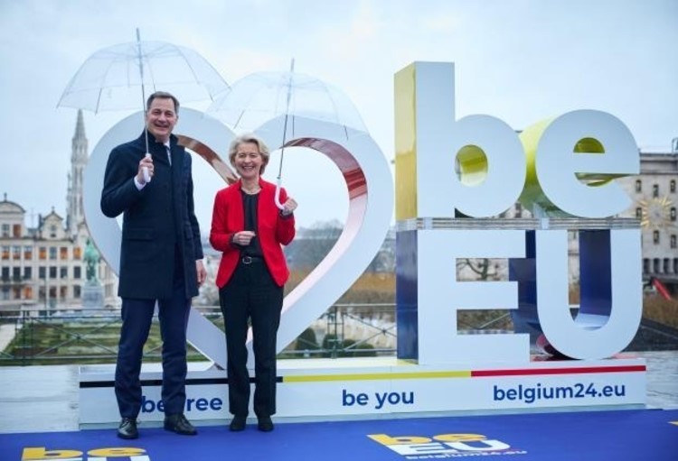 Belgian Prime Minister Alexander De Croo, along with President of the European Commission, Ursula Von Der Leyen, inaugurated the logo of the country's 13th presidency of the EU Council, placed on the Mountain Mont des Arts.
