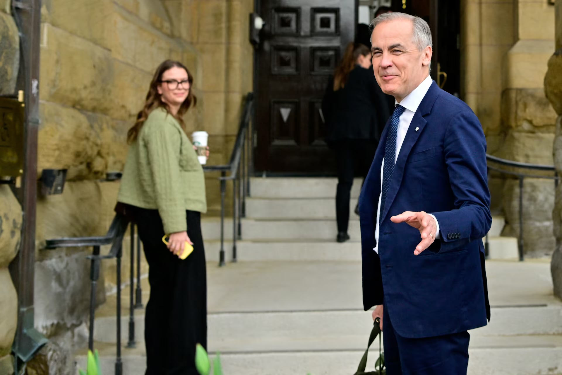 Canada's Prime Minister Mark Carney gestures as he walks into his office after the Liberal Party staged a major political comeback to retain power in parliamentary elections, in Ottawa, Ontario, Canada April 29, 2025. (REUTERS/Jennifer Gauthier) |