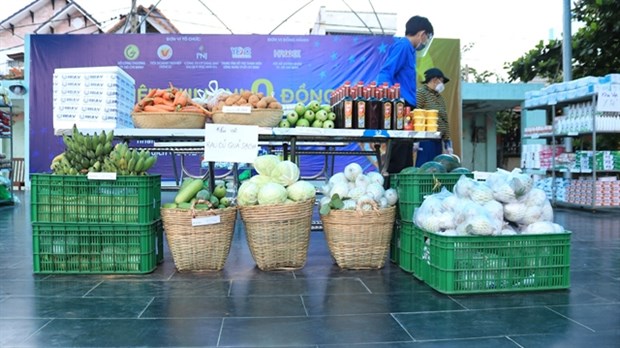 The zero-dong mini supermarket stocks food items such as rice, eggs, cooking oil, instant noodles, fresh foods, vegetables, and medical supplies.