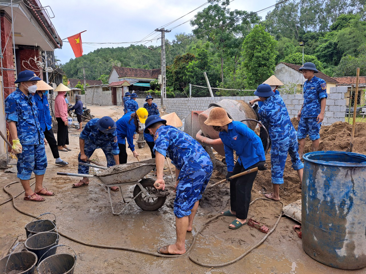 Members of Squadron 102 together with people in Xuan Lam commune leveled and widened the ground and built a wall for inter-village road.
