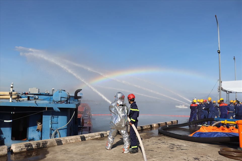 150 people participate in the drill to respond to level-1 oil spill at Tho Quang specialized port in Da Nang City. (photo: nhandan.vn) |